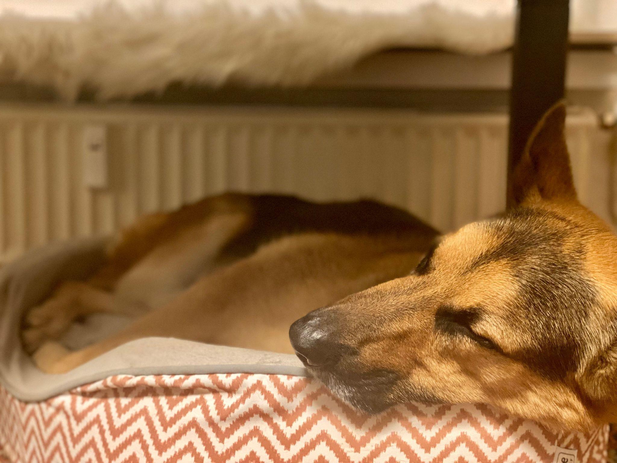Ein Hundekorb nebst Näpfen steht für Ihre Fellnase bereit.