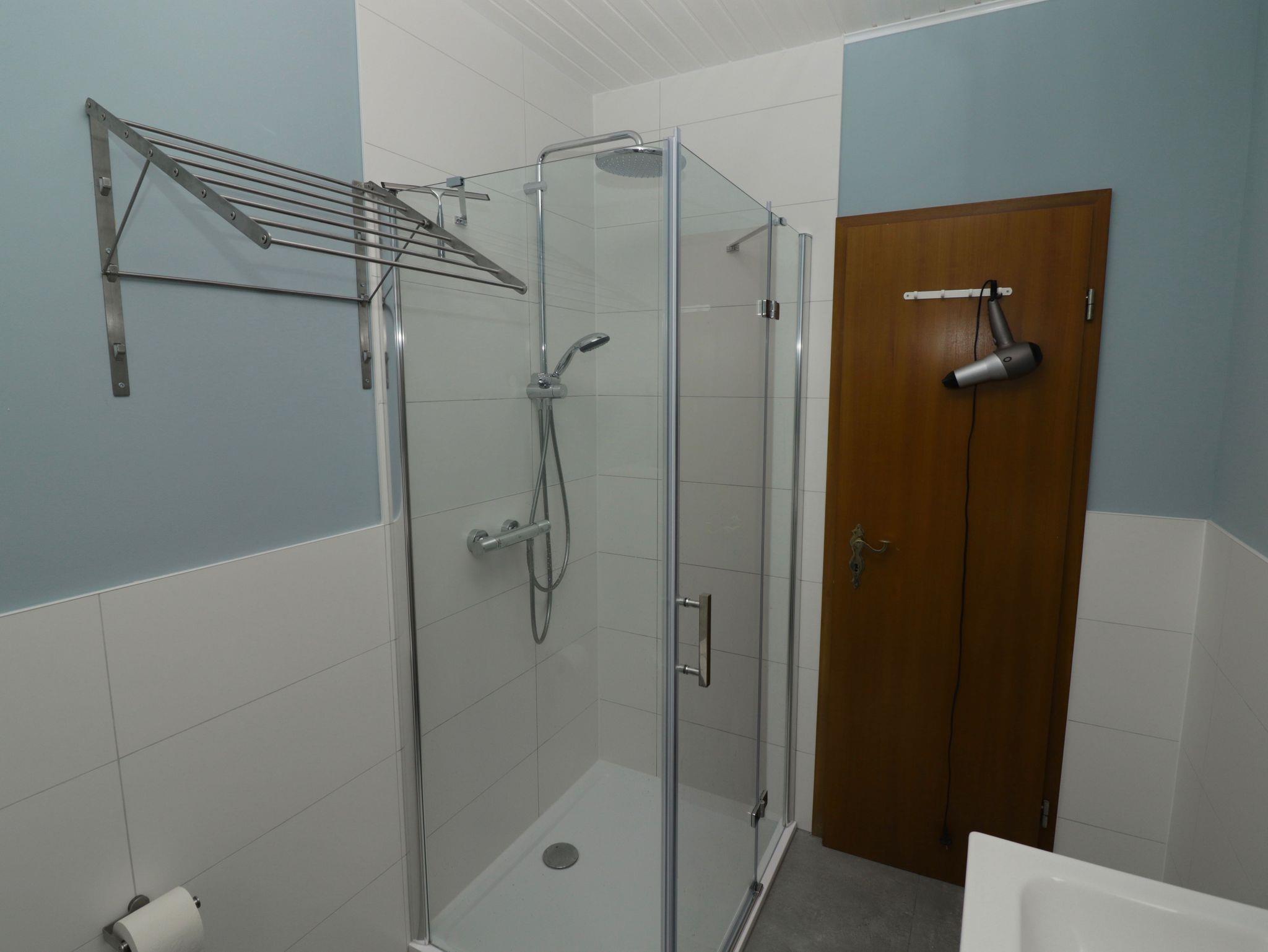 Über einen kleinen Flur erreicht man das ebenfalls 2024 vollständig renovierte Duschbad mit großzügiger bodenebener Duschkabine, einem Hänge-WC und Waschtisch. Außerdem befindet sich dort die Waschmaschine, die als Toplader von oben zu bedienen ist.