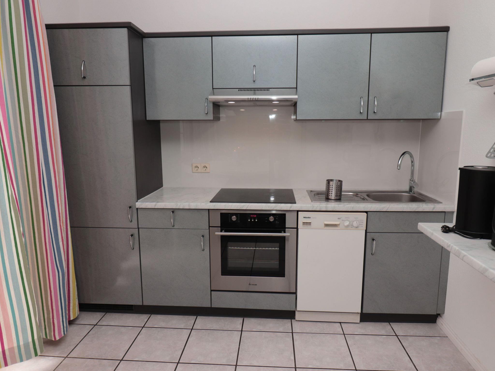 Man betritt das Haus über einen abgeschlossenen Windfang, der ausreichend Platz für Jacken und Schuhe bietet. Durch eine Terrassentür gelangt man in den gefliesten Wohnküchenbereich. Geradeaus führt eine offene Treppe in den Wohnbereich unter dem Dach und am anderen Ende des Raums befindet sich die Küchenzeile. Diese verfügt über einen Induktionsherd mit Backofen (eingebaut 2024), Kühlschrank mit integriertem Gefrierfach und einer Geschirrspülmaschine. Auf dem Ablageregal zur Rechten steht eine Kaffeemaschine, Wasserkocher und Toaster. In diesem Raum befindet sich weiterhin ein runder, ausziehbarer Esstisch mit fünf Stühlen und ein TrippTrapp Kinderstuhl, sowie ein Vorratsschrank unter der Treppe. Über eine Terrassentür links neben der Kochzeile gelangt man auf die Terrasse in Südlage,