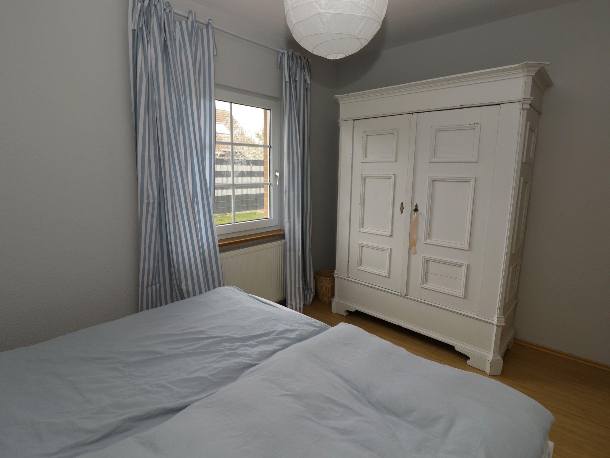 Vom Flur zweigen auch die beiden Schlafzimmer ab. Im Elternschlafzimmer befindet sich ein aus weißem Massivholz gearbeitetes Doppelbett mit den Maßen 180 x 200 cm und dem gegenüber steht ein skandinavischer antiker Kleiderschrank, ebenfalls aus massivem Weichholz sowie mit Kassettentüren und Dekor des 19. Jahrhunderts versehen.