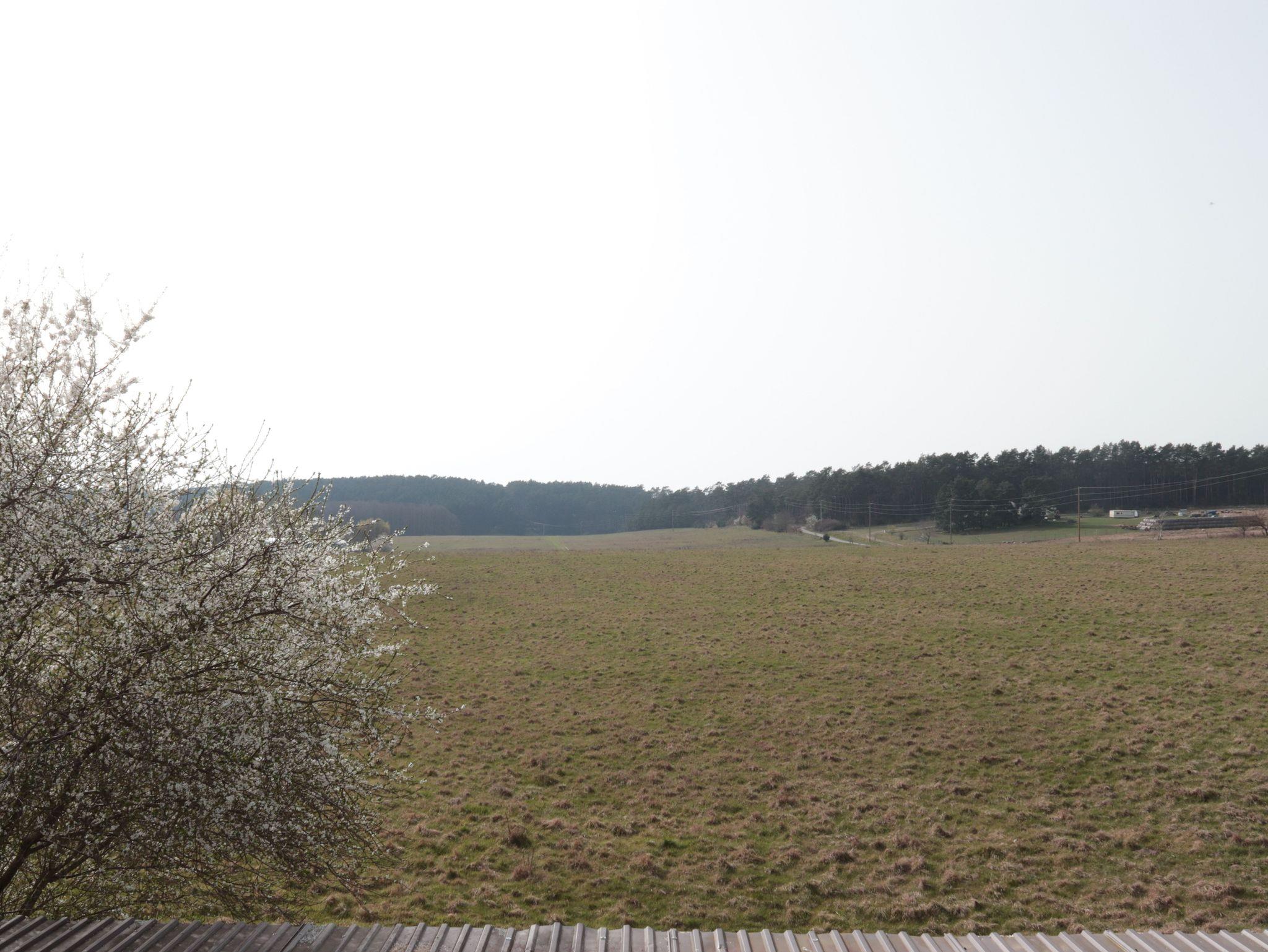 Dieser Raum wird über zwei große Dachflächenfenster in Südausrichtung hell erleuchtet und durch das kleine Sprossenfenster am Giebel öffnet sich der Blick auf die große angrenzende Wiese, auf der gelegentlich Schafe grasen.