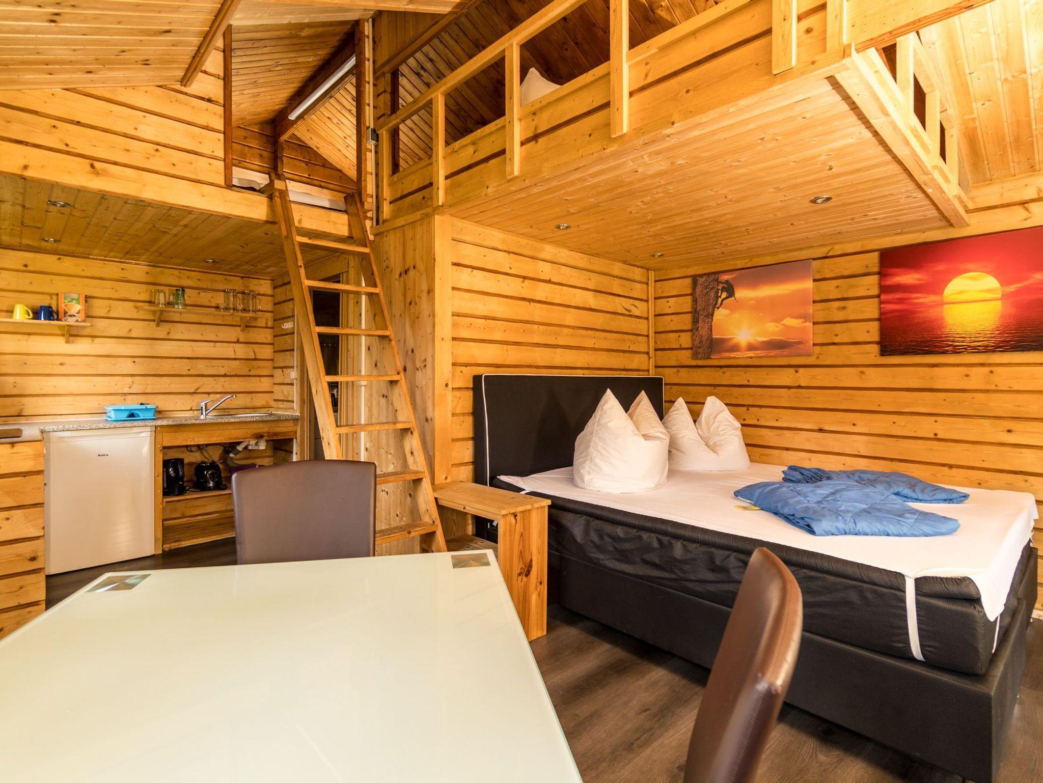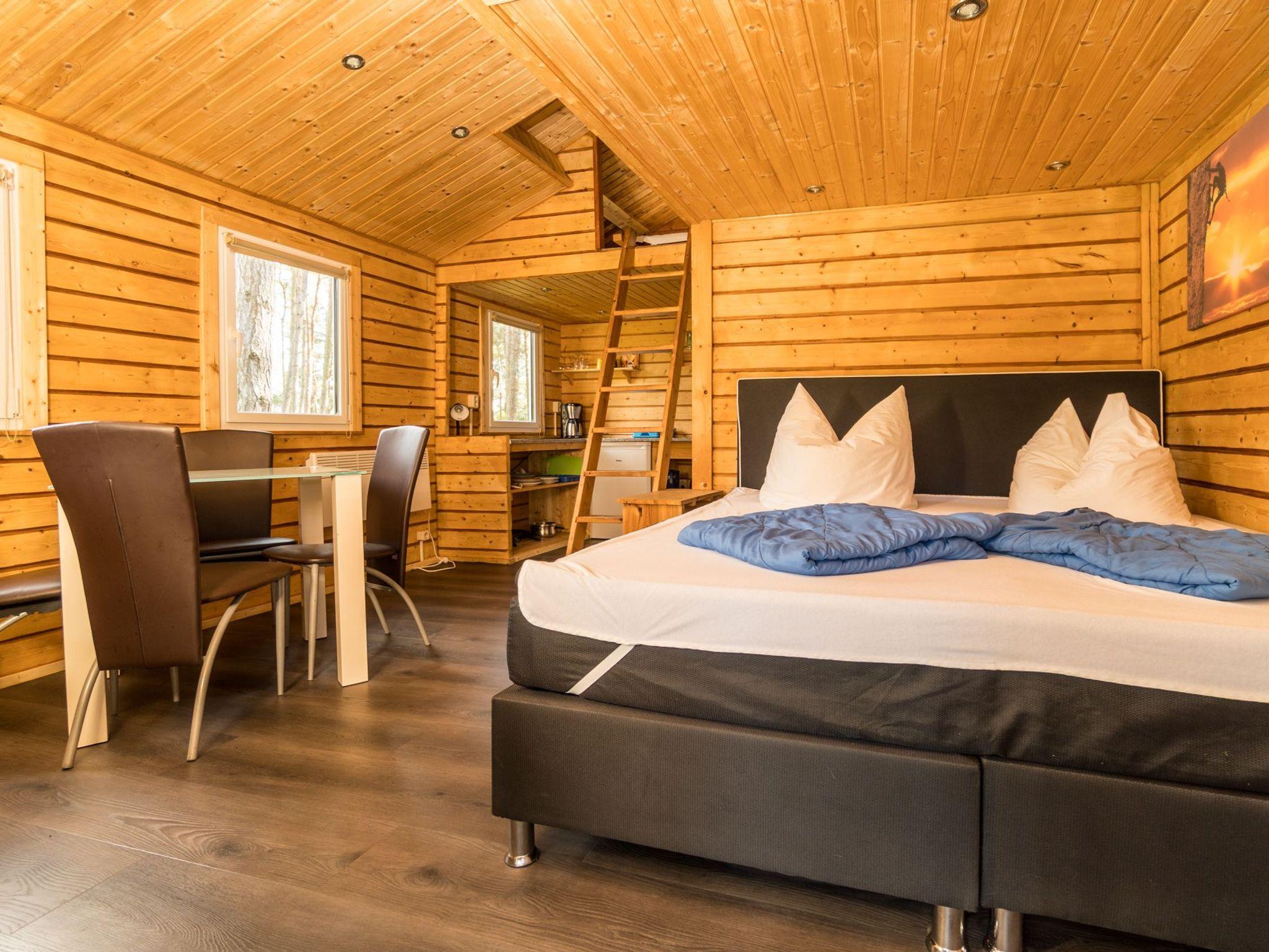 Der Bungalow verfügt über zwei Etagen. Die obere Etage ist ein Schlafboden für zwei Personen mit dicker Matraze ( 140x200cm) und über eine Leiter zu erreichen. Die untere Etage besteht aus einem großen Raum mit TV-Ecke, einer Flachstrecken für ihre Garderobe, einer Schlafnische mit Boxspring-Doppelbett (180x200cm) und der Küchenzeile. Separat befindet sich ein Bad mit Toilette und einer Dusche.