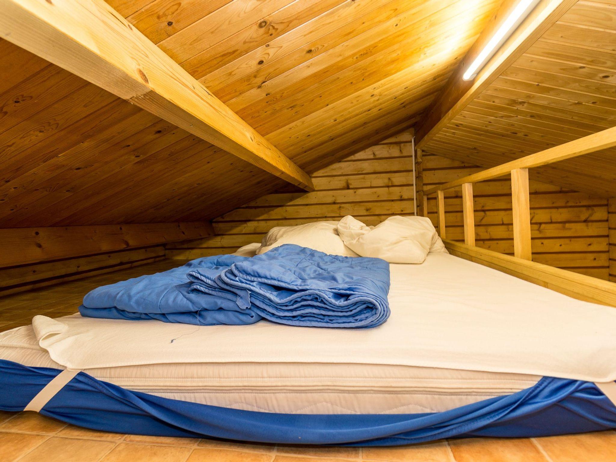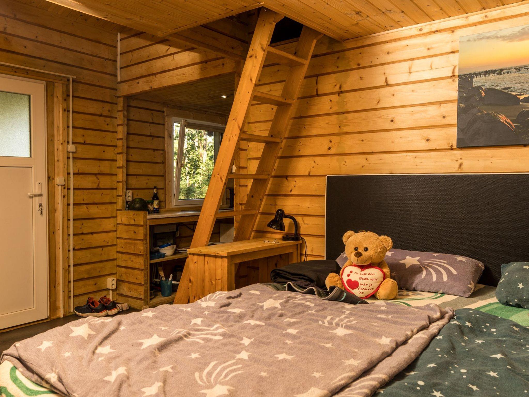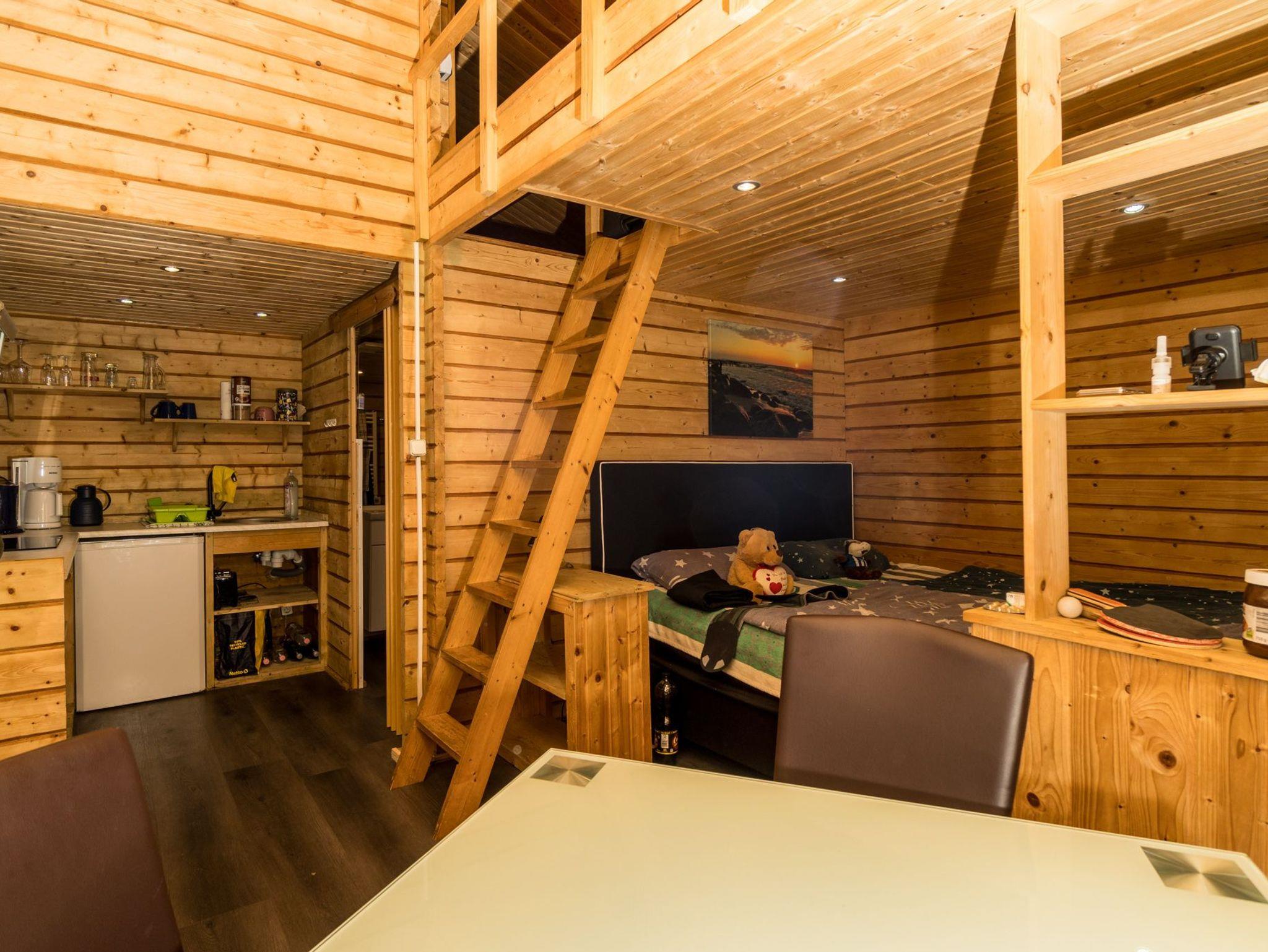 Der Bungalow verfügt über zwei Etagen. Die obere Etage ist ein Schlafboden für zwei Personen mit dicker Matraze (140x200cm) und über eine Leiter zu erreichen. Die untere Etage besteht aus einem großen Raum mit TV-Ecke, einer Flachstrecken für ihre Garderobe, einer Schlafnische mit Boxspring-Doppelbett (180x200cm) und der Küchenzeile. Separat befindet sich ein Bad mit Toilette und einer Dusche.