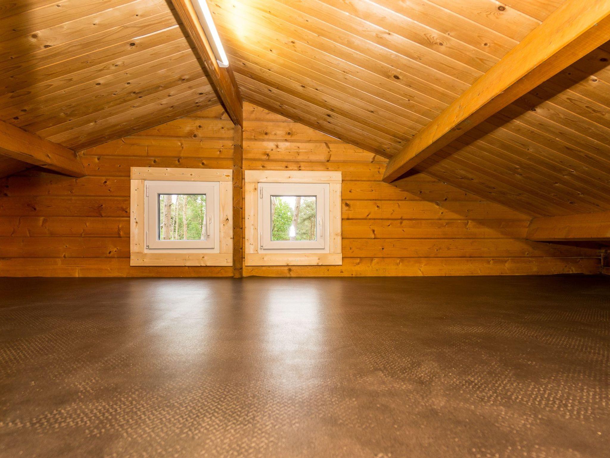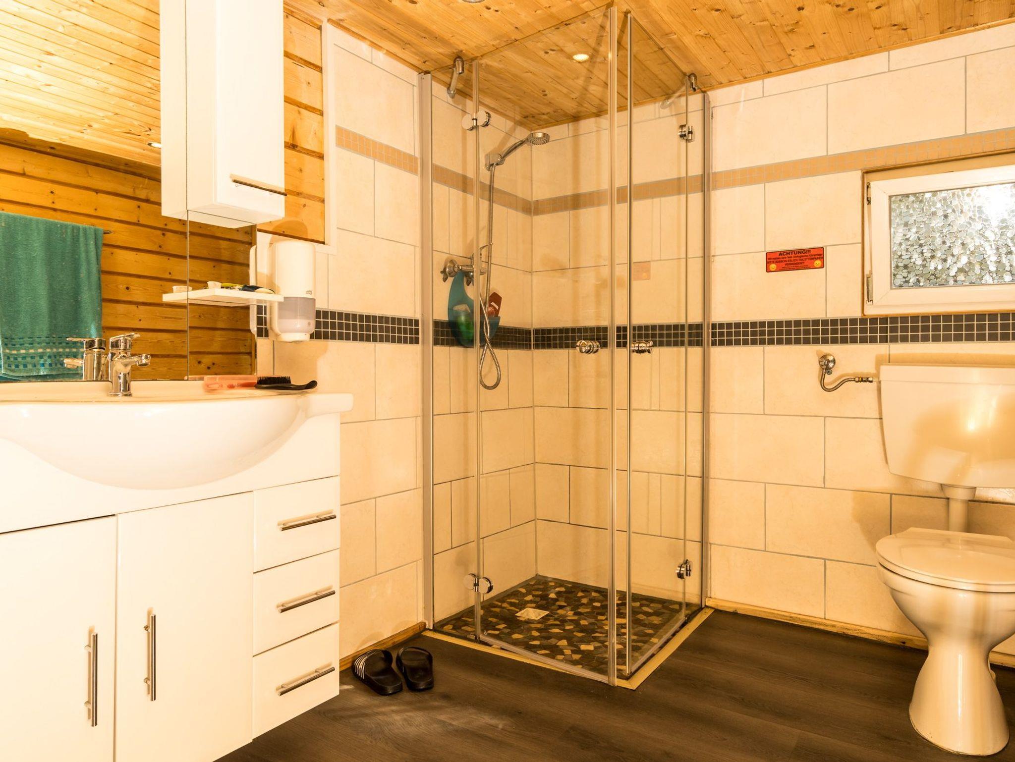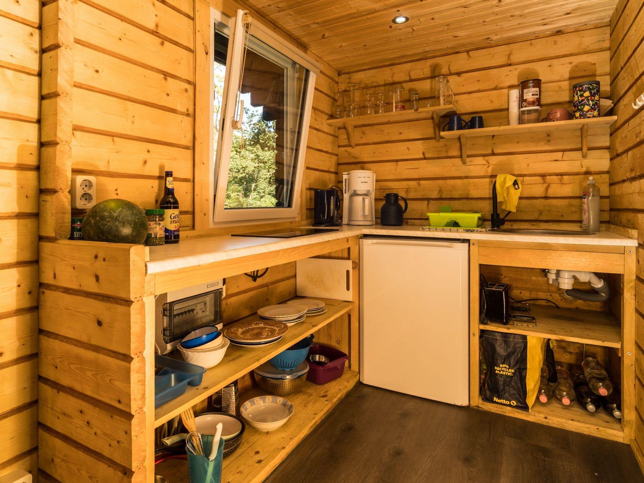 Der Bungalow verfügt über zwei Etagen. Die obere Etage ist ein Schlafboden für zwei Personen mit dicker Matraze (140x200cm) und über eine Leiter zu erreichen. Die untere Etage besteht aus einem großen Raum mit TV-Ecke, einer Flachstrecken für ihre Garderobe, einer Schlafnische mit Boxspring-Doppelbett (180x200cm) und der Küchenzeile. Separat befindet sich ein Bad mit Toilette und einer Dusche.
