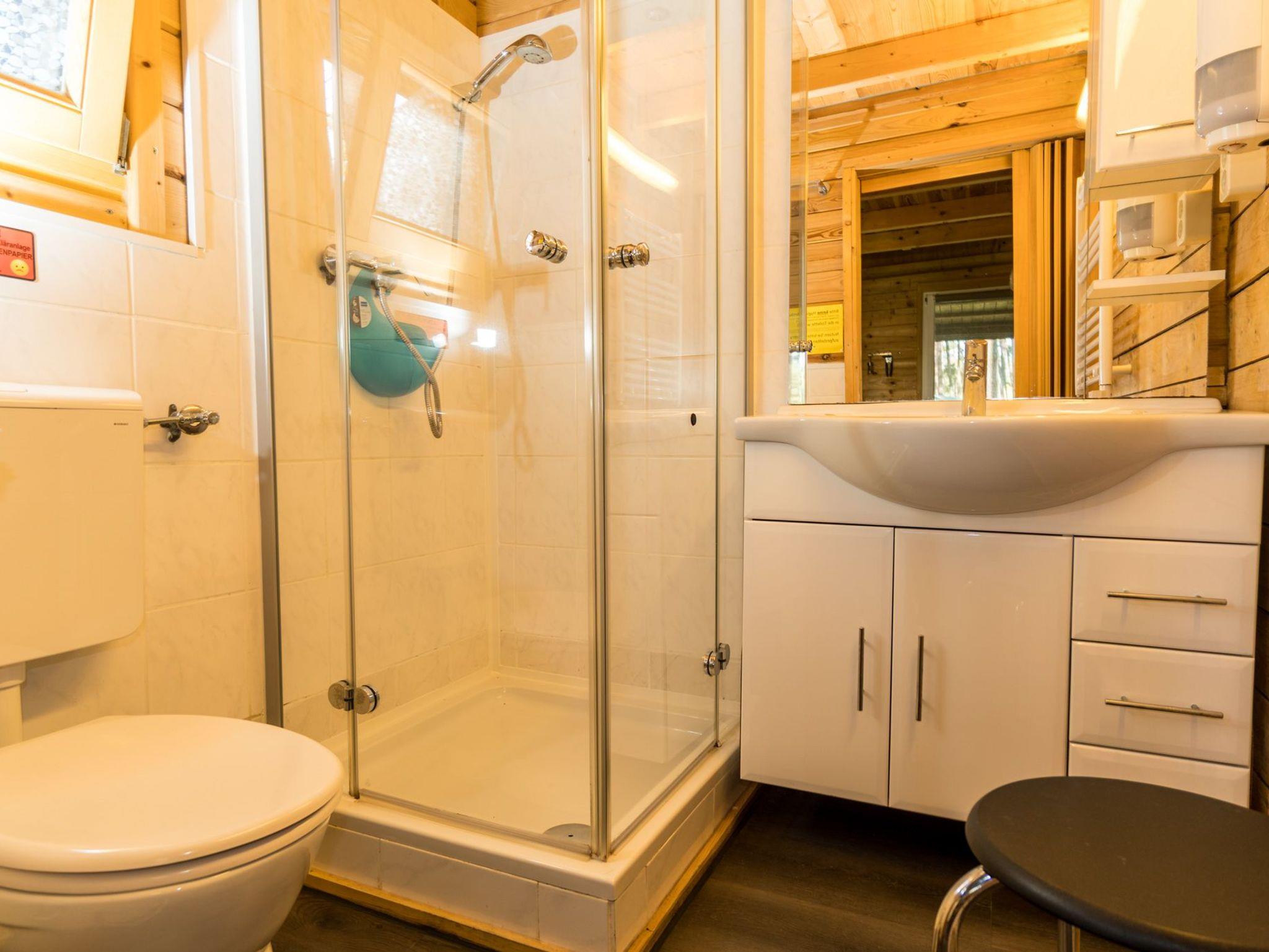 Der Bungalow verfügt über zwei Etagen. Die obere Etage ist ein Schlafboden mit dicker Matraze (160x200cm) für zwei Personen und über eine Leiter zu erreichen. Die untere Etage besteht aus einem großen Raum mit TV-Ecke, einer Flachstrecken für ihre Garderobe, einer Schlafnische mit Boxspring-Doppelbett (160x200cm) und der Küchenzeile. Separat befindet sich ein Bad mit Toilette und einer Dusche.