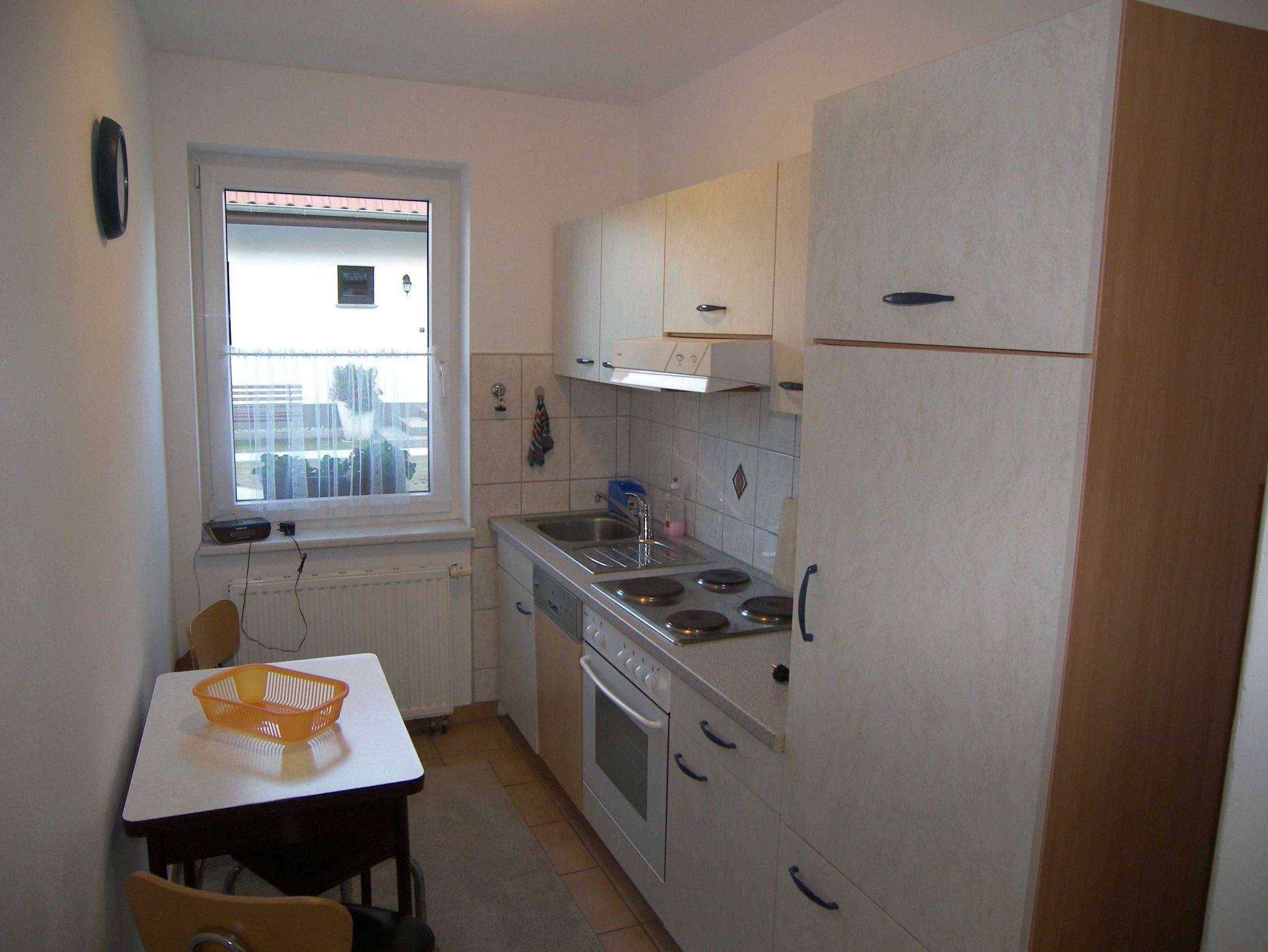 Die Wohnung verfügt über eine separate Küche mit 4 Platten-Herd mit Backofen, Wasserkocher, Toaster und Kaffeemaschine und einem kleinen Esstisch mit 2 Stühlen.