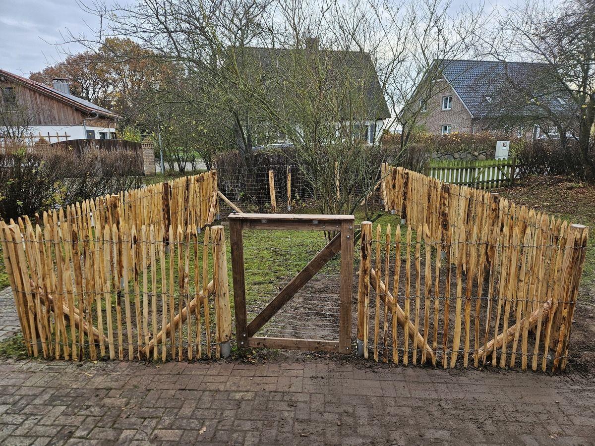Die linke Doppelhaushälfte steht auf einem ca. 500 m² großen Gartengrundstück, das nur teilweise eingezäunt ist. Zur sicheren Unterbringung von Haustieren befindet sich vor dem Haus ein vollständig eingezäunter Bereich von ca. 40 m². Die Staketen des Zauns sind ca. 1,20 m hoch. Der Bereich befindet sich zwischen Terrasse und vorderer Grundstücksgrenze zur Straße und ist vom Koch-/ Essbereich vollständig einsehbar.