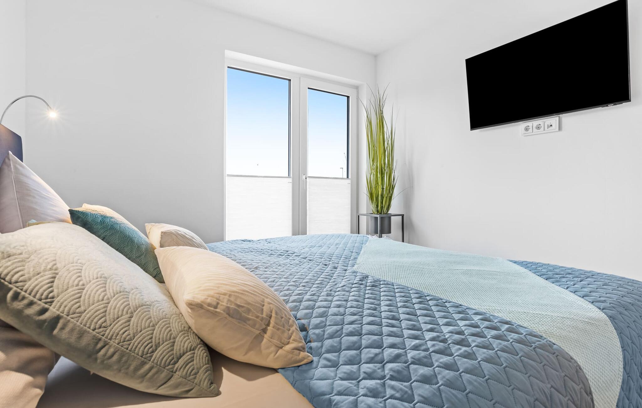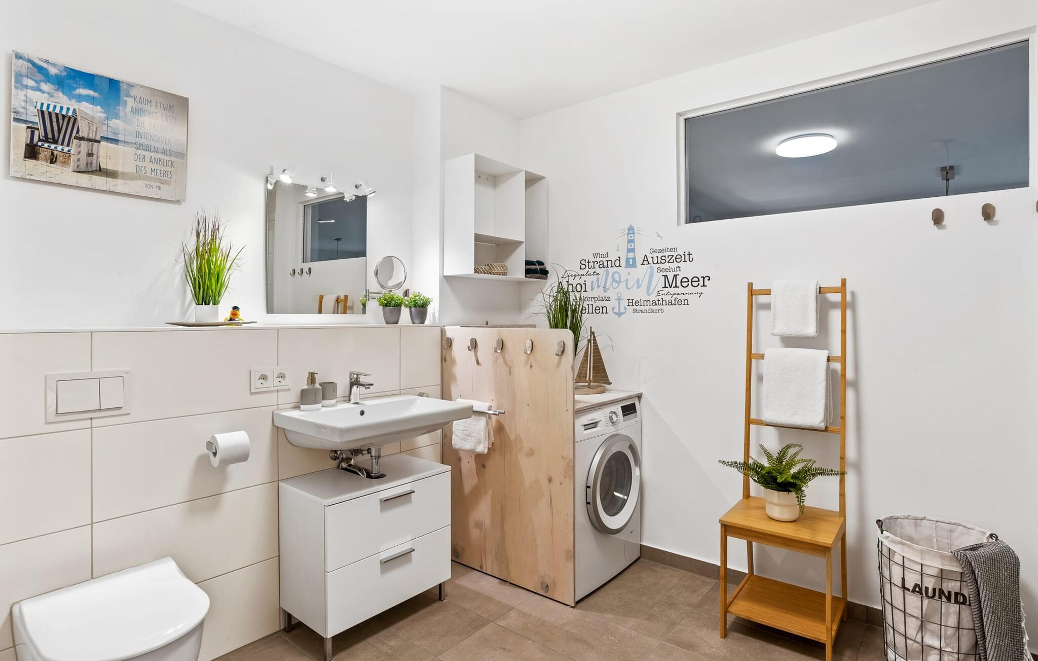 To soveværelser med komfortable boxmadrasser er tilgængelige til afslapning om natten. Det ene soveværelse er udstyret med en dobbeltseng, mens det andet soveværelse med to enkeltsenge inviterer dig til at sove godt. Med nogle få enkle trin kan sofaen i stuen forvandles til en ekstra soveplads. En baby er også velkommen.