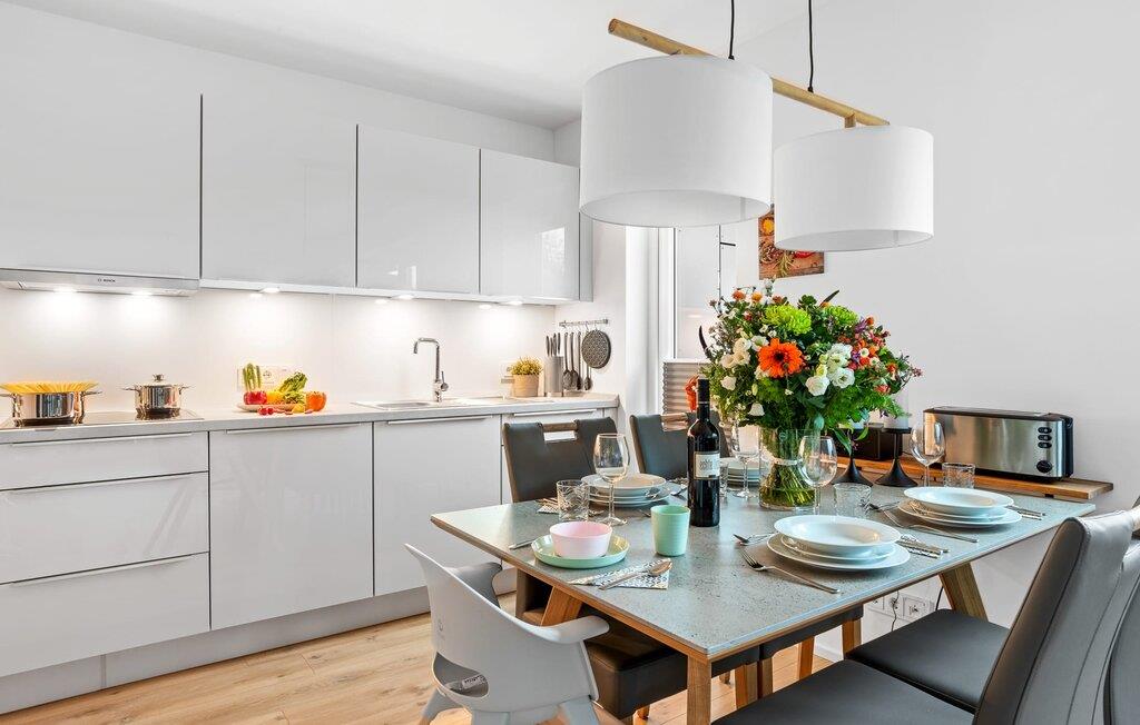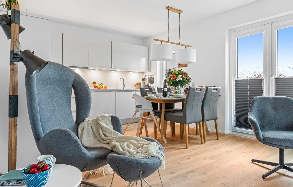 Med sin gulv til loft-vinduesfront og den store tilstødende terrasse er det åbne stue/alrum lejlighedens hjerte. At komme ind her og straks føle sig hjemme er én ting. At slappe af i den hyggelige opholdsstue, nyde naturens fred og ro ud af vinduet eller se tv er ren afslapning og afslapning! Hverdagen bliver mere og mere fjern – i sandhed en DEJLIG LYKKE til en skøn ferie.