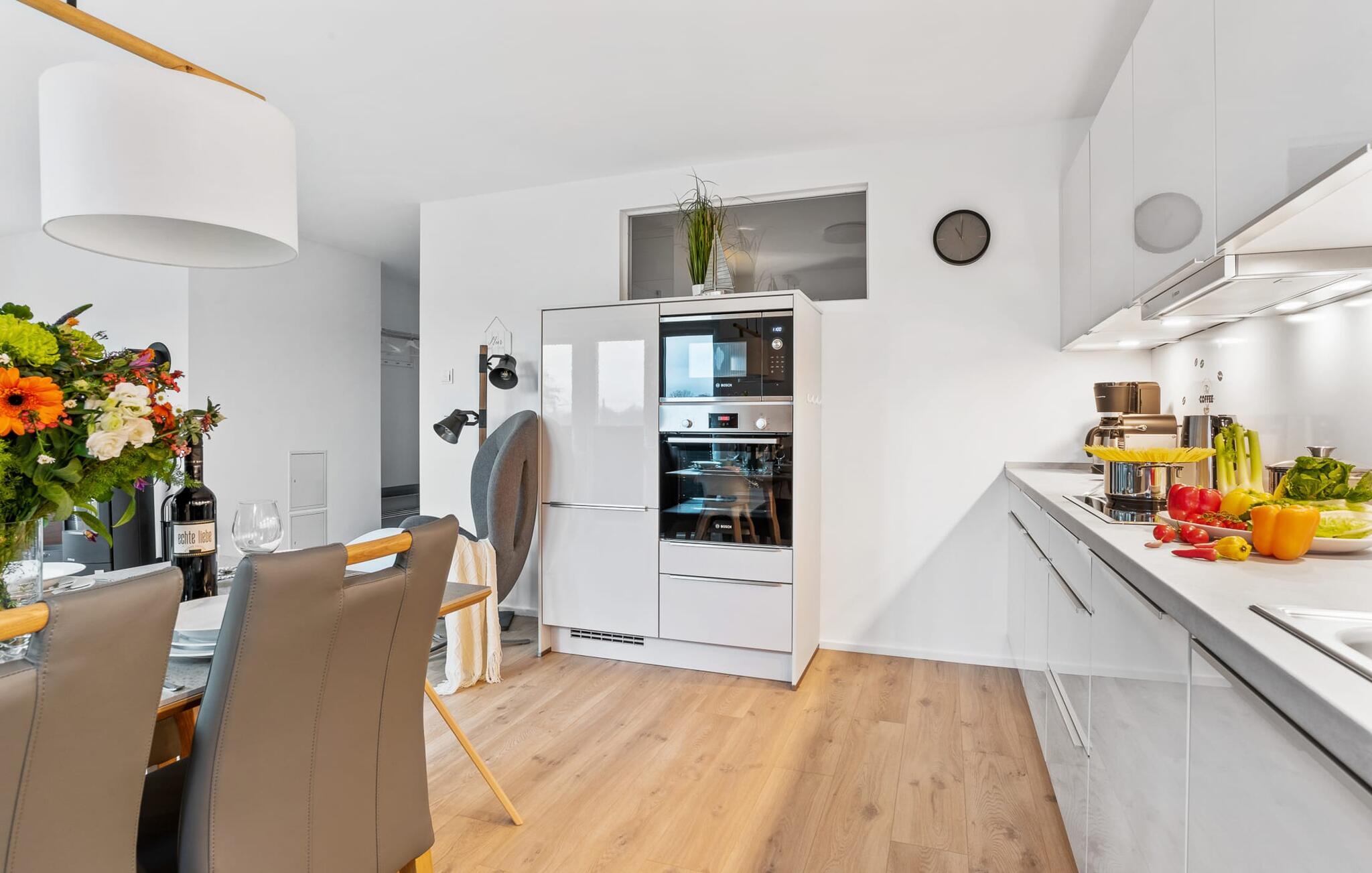 Det integrerede køkken er perfekt udstyret, og det er sjovt at lave mad sammen. Så nyd de færdige lækkerier på terrassen eller start en hyggelig grillaften med Weber el-grill. Det er ren ferie.