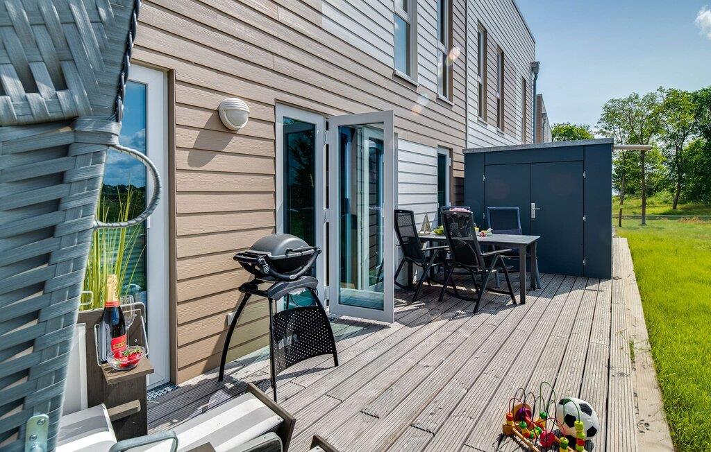 Direkte fra opholdsrummet kommer man ind på den store terrasse med syd-vest orientering. Dette tilbyder afslappende timer væk fra stress og jag i resten af ??feriestedet ved Østersøen. Vender mod bagsiden med udsigt over den naturbeskyttede strandenge, marker og havet inviterer havemøblerne og den komfortable strandstol dig til at tilbringe en afslappende ferie.