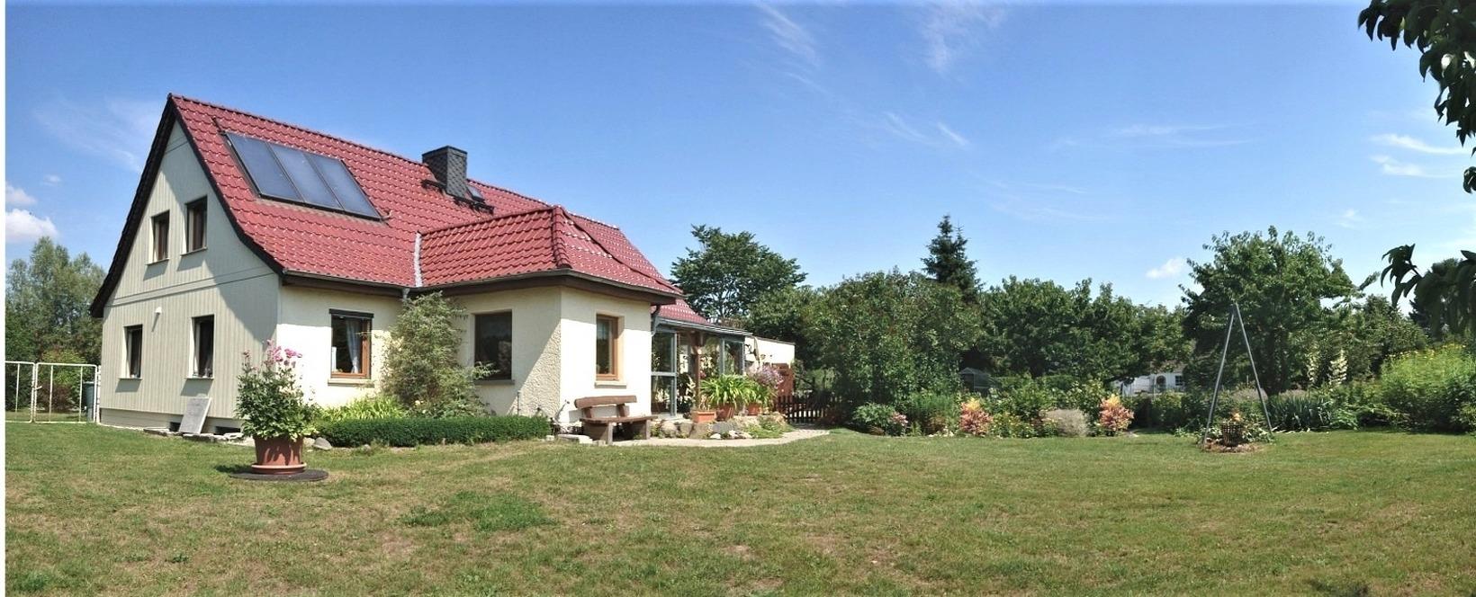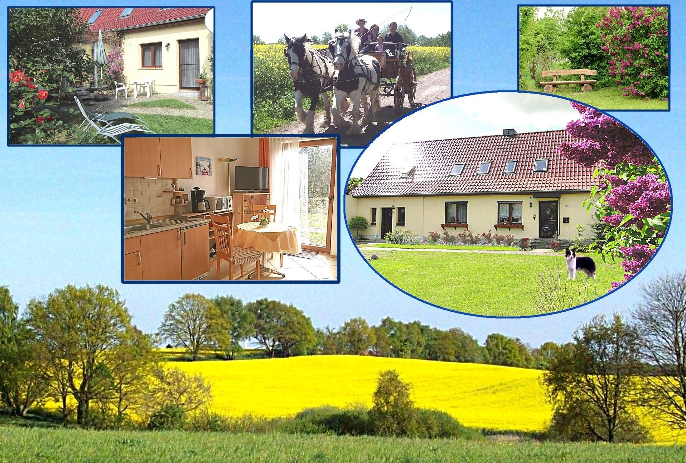Auf unserem 6000 m² großen Grundstück mit Obstbäumen sind auch Tiere zu Hause, wie die Border-Colliehündin Fly, zwei Katzen, Pferde, Kaninchen, Enten und Hühner. Letztere liefern Ihnen das frische Frühstücksei. Kutschfahrten, Reiten und Reitunterricht sind möglich.