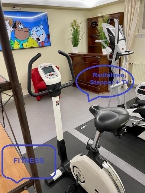Im Untergeschoss des Hauses befinden sich ein großer Fitnessraum mit verschiedensten Geräten, sowie unsere Sauna.