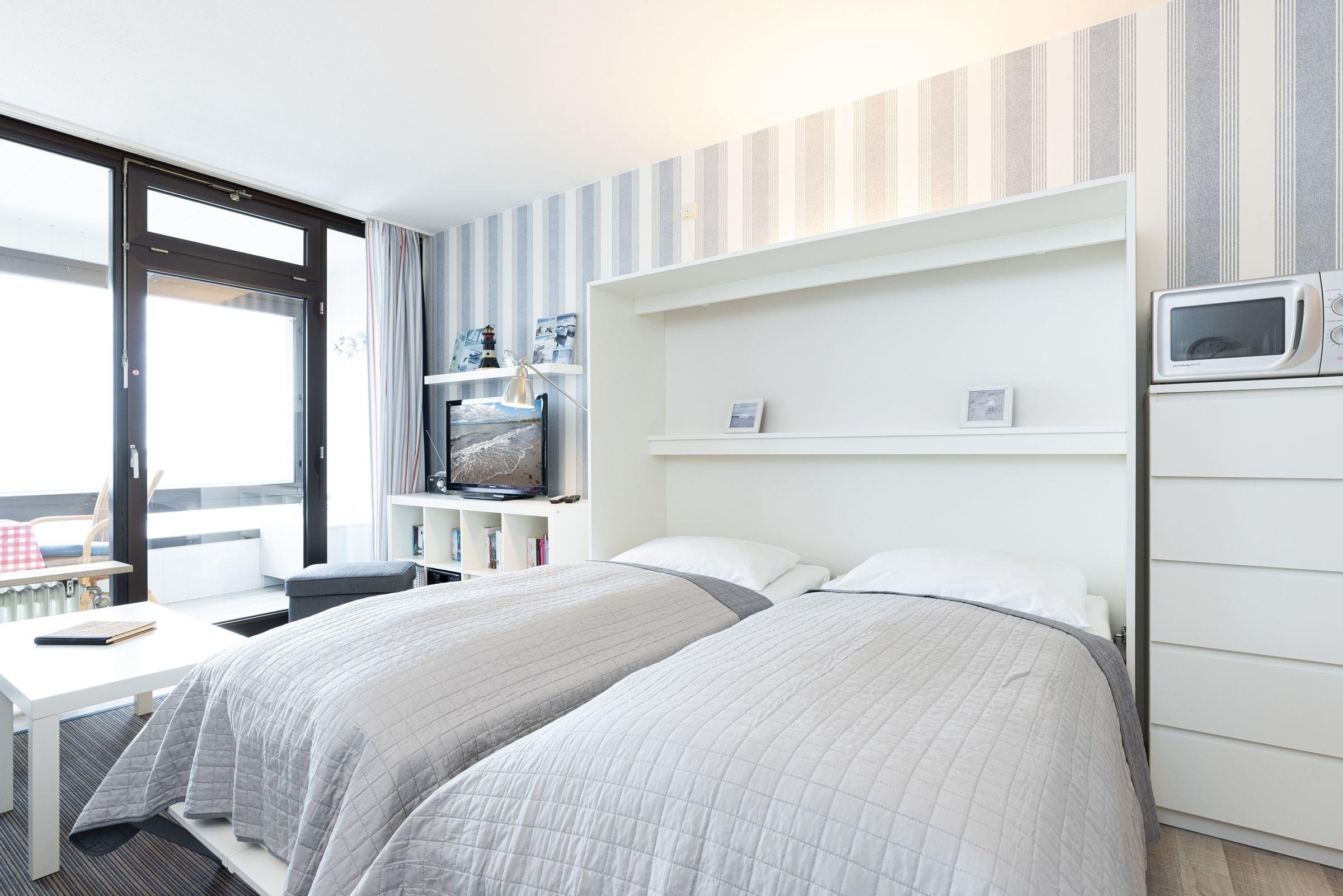 Wohnzimmer: 1 Schrankbett (2x 90x200 cm), Kleiderschrank, TV, Verdunkelung: Gardine, Platz für Babybett vorhanden
