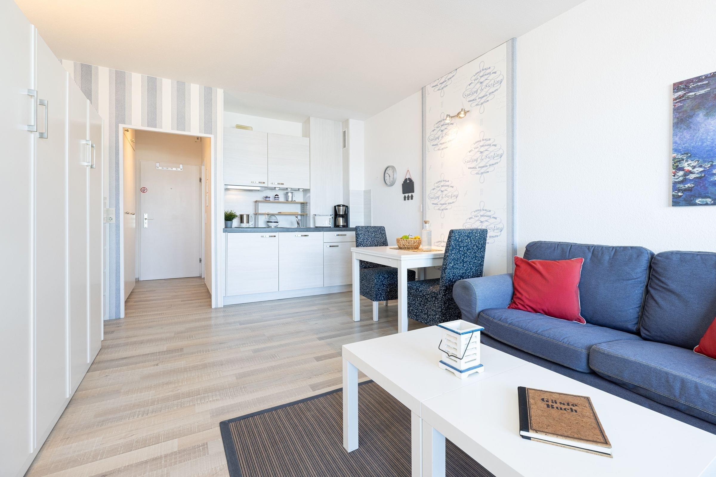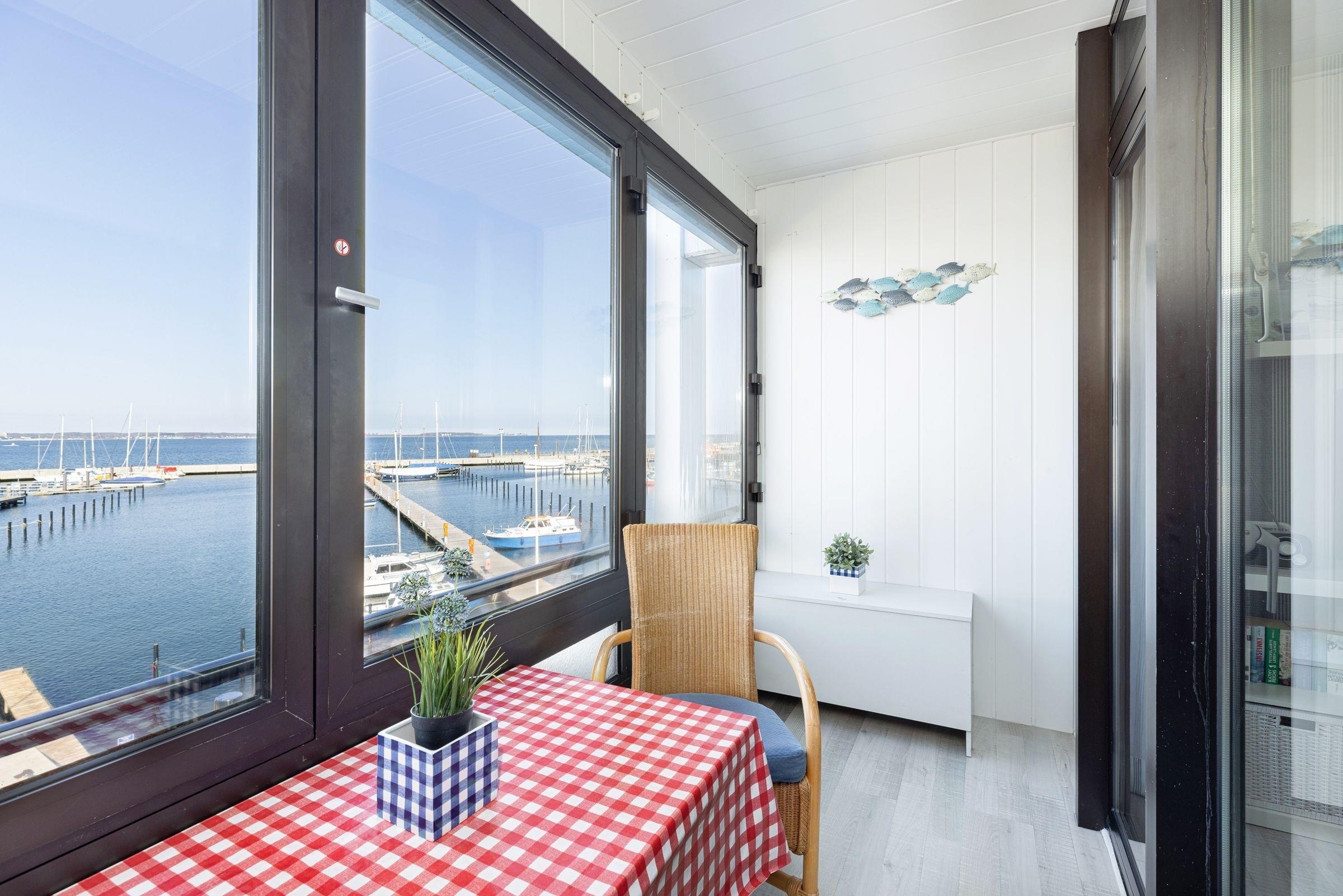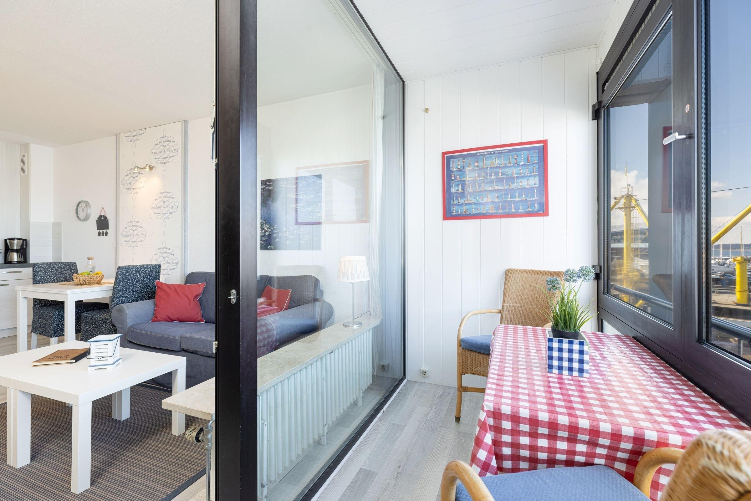 Die helle, ca. 30 m² große 1-Zimmer-Ferienwohnung befindet sich im 2. Stock eines gepflegten Appartementhauses direkt am Yachthafen von Laboe und bietet genügend Platz für bis zu 2 Personen.