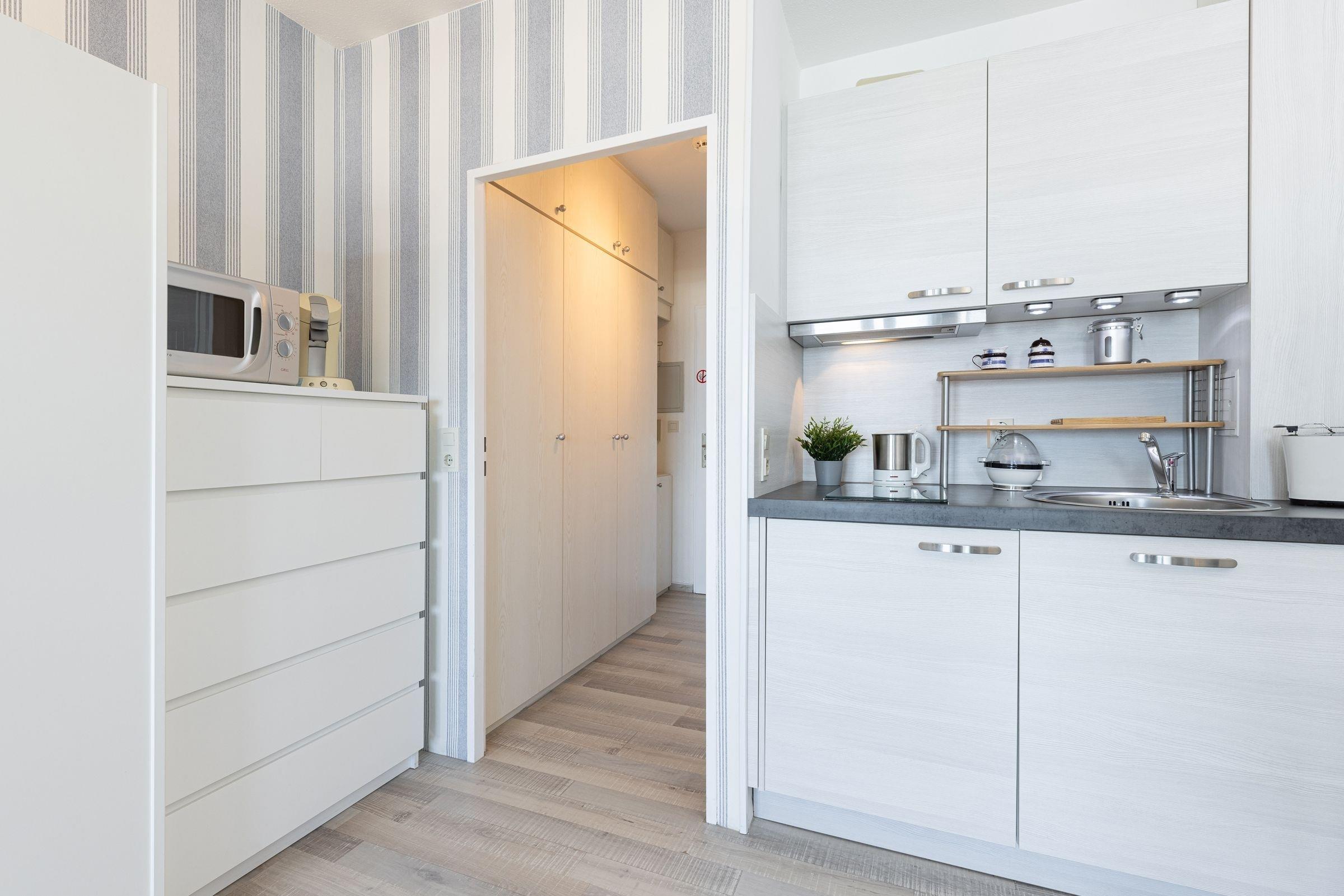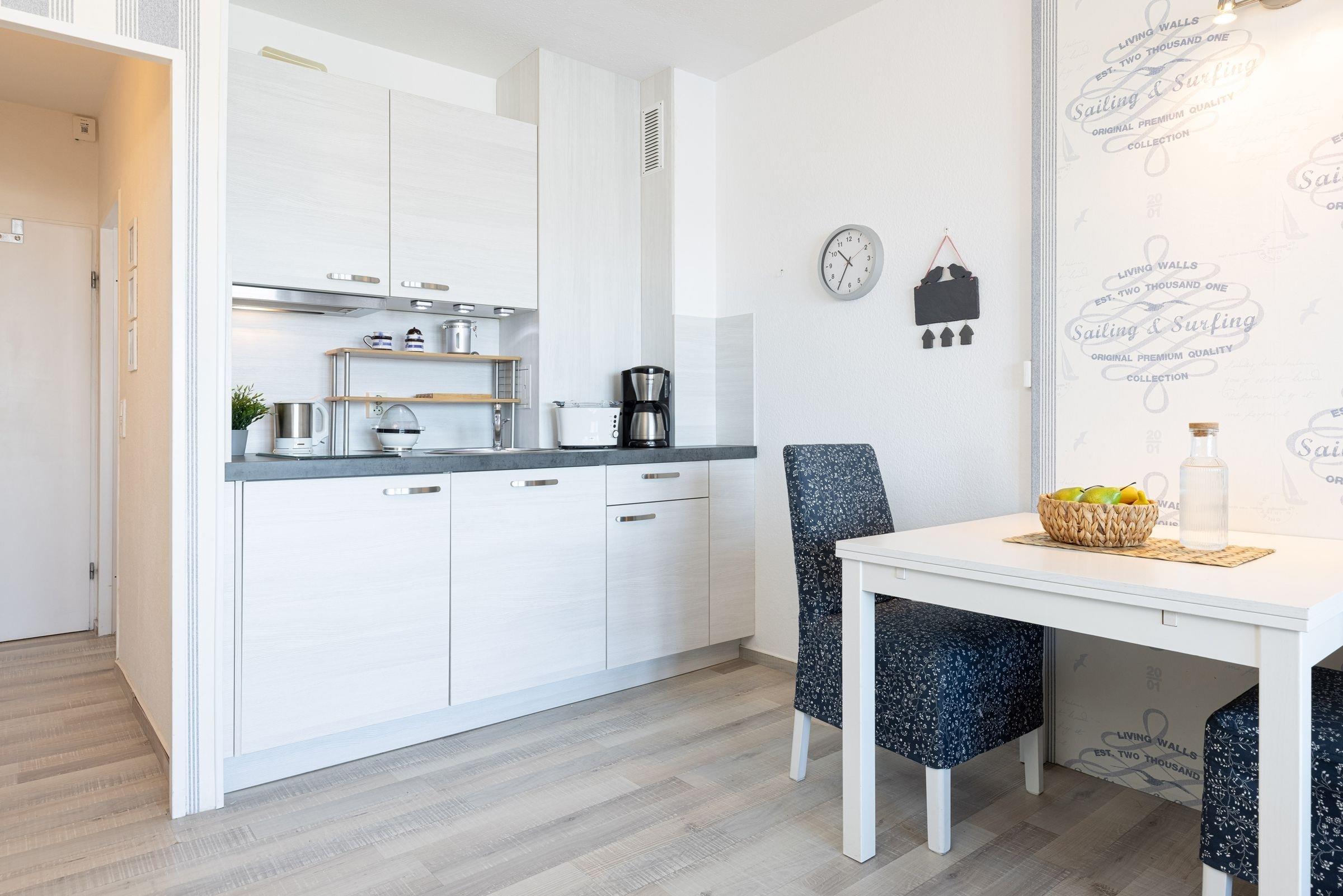 Die kleine, liebevoll eingerichtete Wohnung ist bequem per Fahrstuhl (100x100 cm) zu erreichen. Der kombinierte Wohn/-Ess- und Schlafbereich verfügt über eine kleine Pantry-Küche mit einem Essplatz sowie einer Couch und einem Schrankbett (2x 90x200 cm). Das innenliegende Badezimmer mit Wanne mit Duschfunktion rundet das Angebot ab. Ein Highlight ist sicher die Loggia. Von hier aus können Sie wunderbar den Schiffsverkehr auf der Kieler Förde beobachten. Die Fenster lassen sich übrigens vollständig öffnen, sodass Sie bei Bedarf auch die gute Seeluft reinlassen können. Zum Yachthafen sind es keine 50 m. Überfahrten mit der Fähre nach Kiel oder zum Westufer gehören bei einem Laboe-Aufenthalt zum Pflichtprogramm.