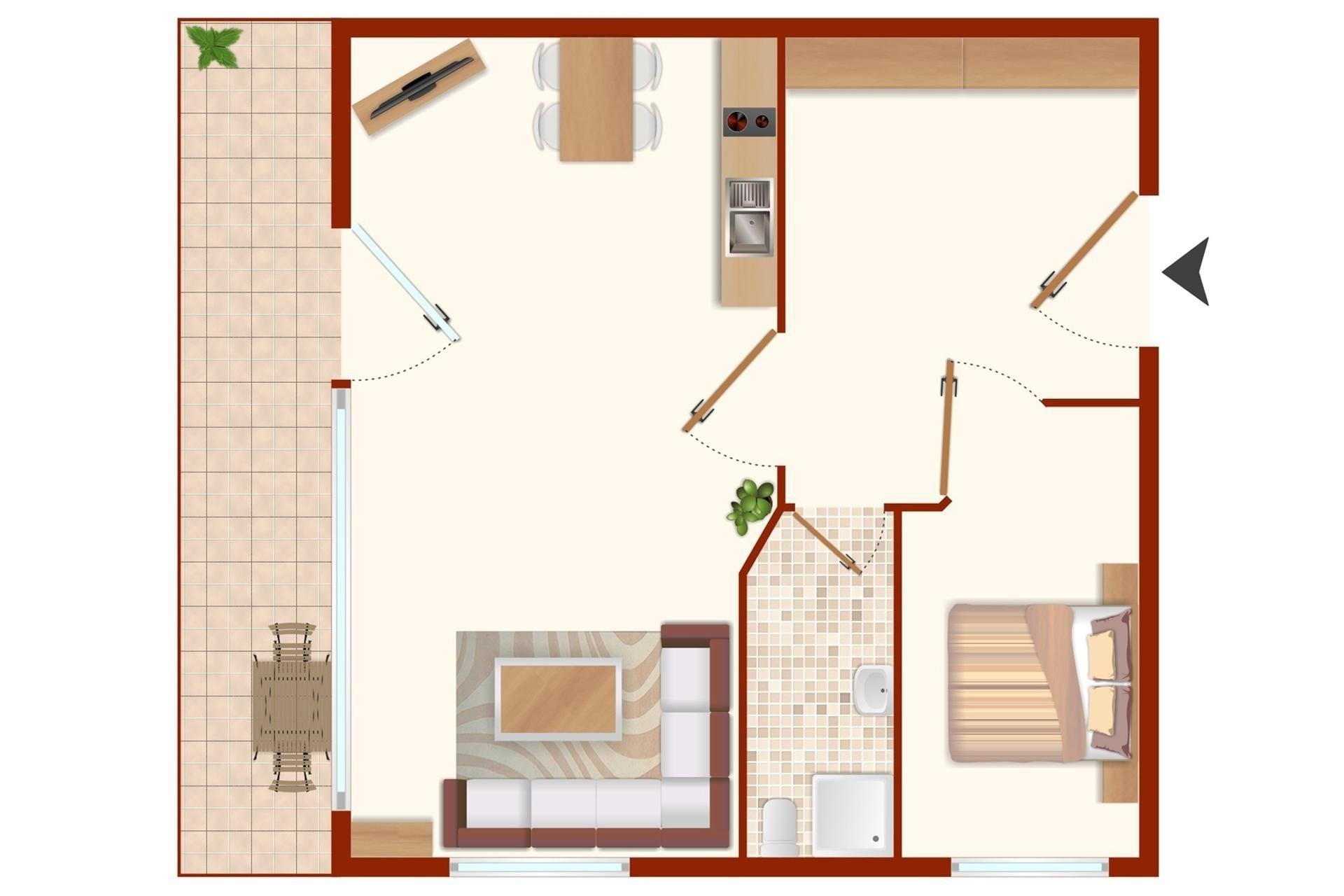 Die Wohnung hat ein offenen Wohn- und Essbereich mit einer kleinen Küchenzeile, ein Schlafzimmer mit einem Doppelbett (160x200 cm), sowie ein Duschbad. In der Küchenzeile können Sie kleinere Gerichte auf dem 2er Cerankochfeld zubereiten.