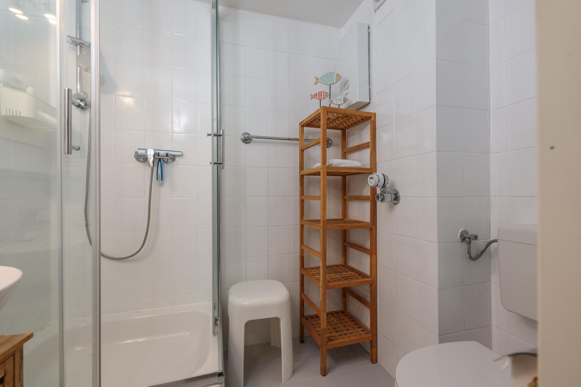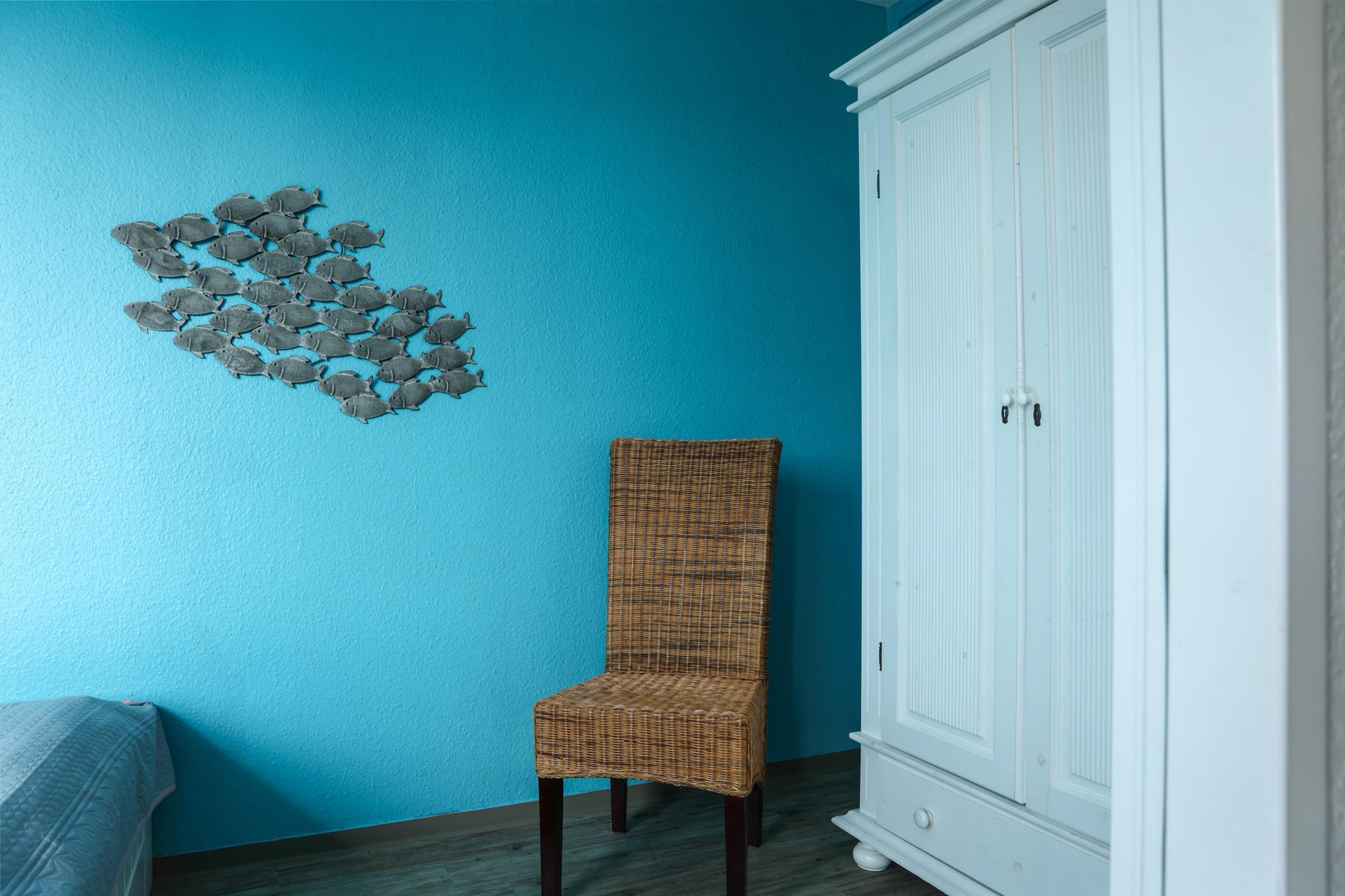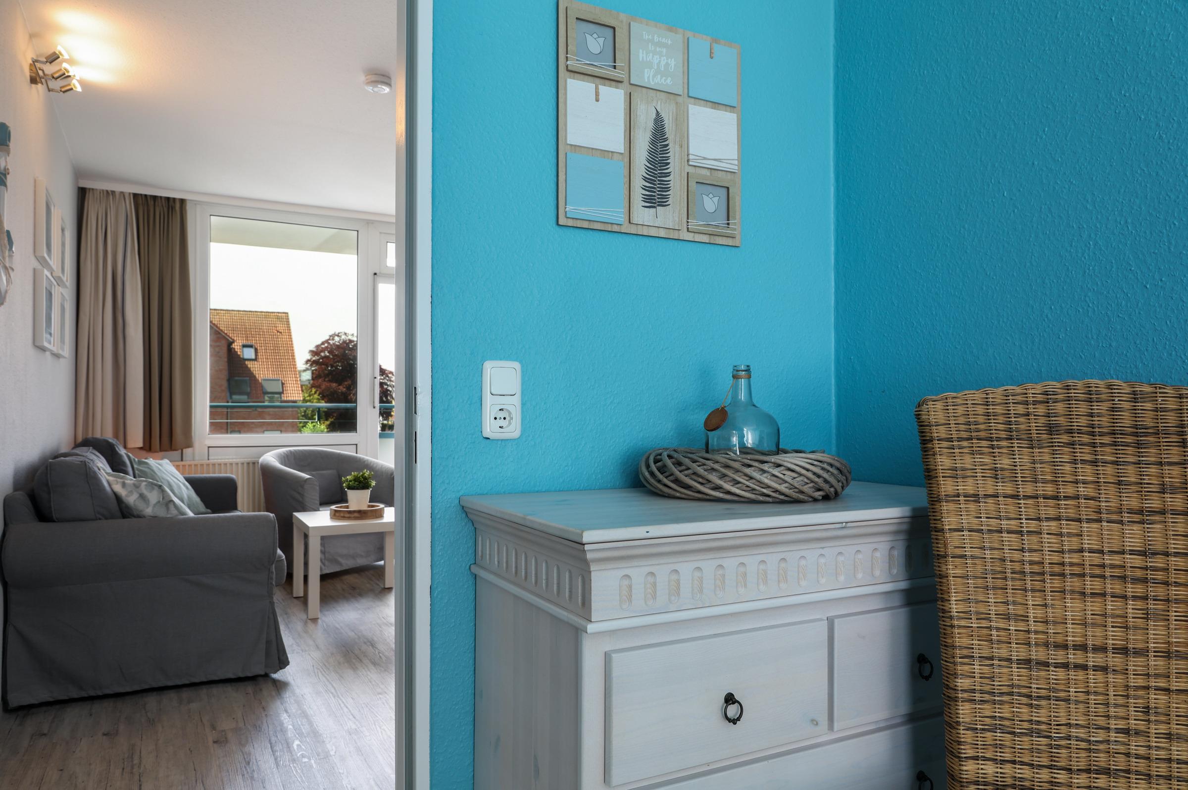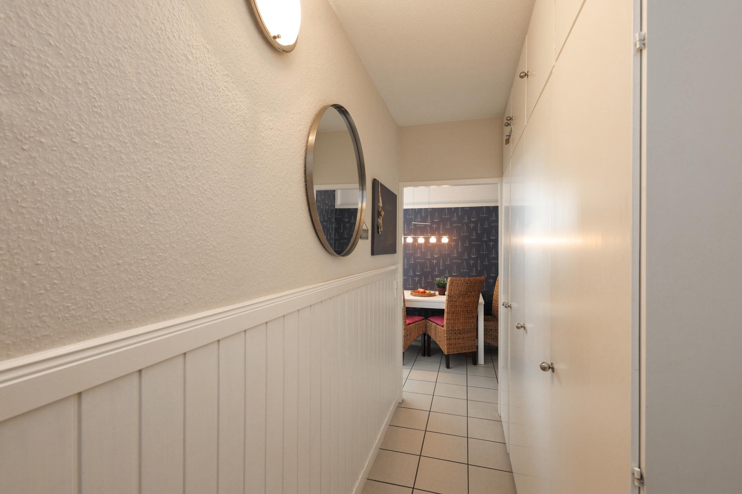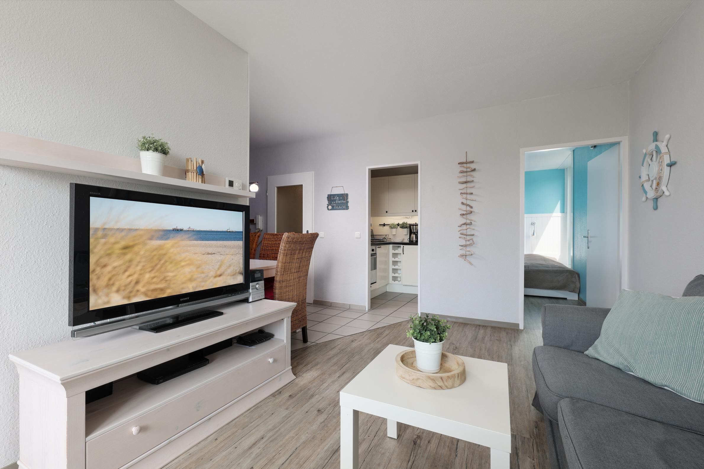 Über einen hellen Flur gelangen Sie in das kombinierte Wohnzimmer mit Essecke mit nordischem Ambiente. Von da ab gehen 2 voneinander getrennte Schlafzimmer mit jeweils eingebauten Doppelbetten. Zudem haben Sie eine separate, gut eingerichtete Küche an der angrenzenden gemütlichen Essecke. Das innenliegende, gepflegte Duschbad mit Handtuchheizung und elektrischem Lüfter geht vom Flur ab. Ein kleiner, möblierter Balkon lädt zum Verweilen ein. Für unsere Angler halten wir einen Gefrierschrank mit separaten Fächern im Haus bereit.
