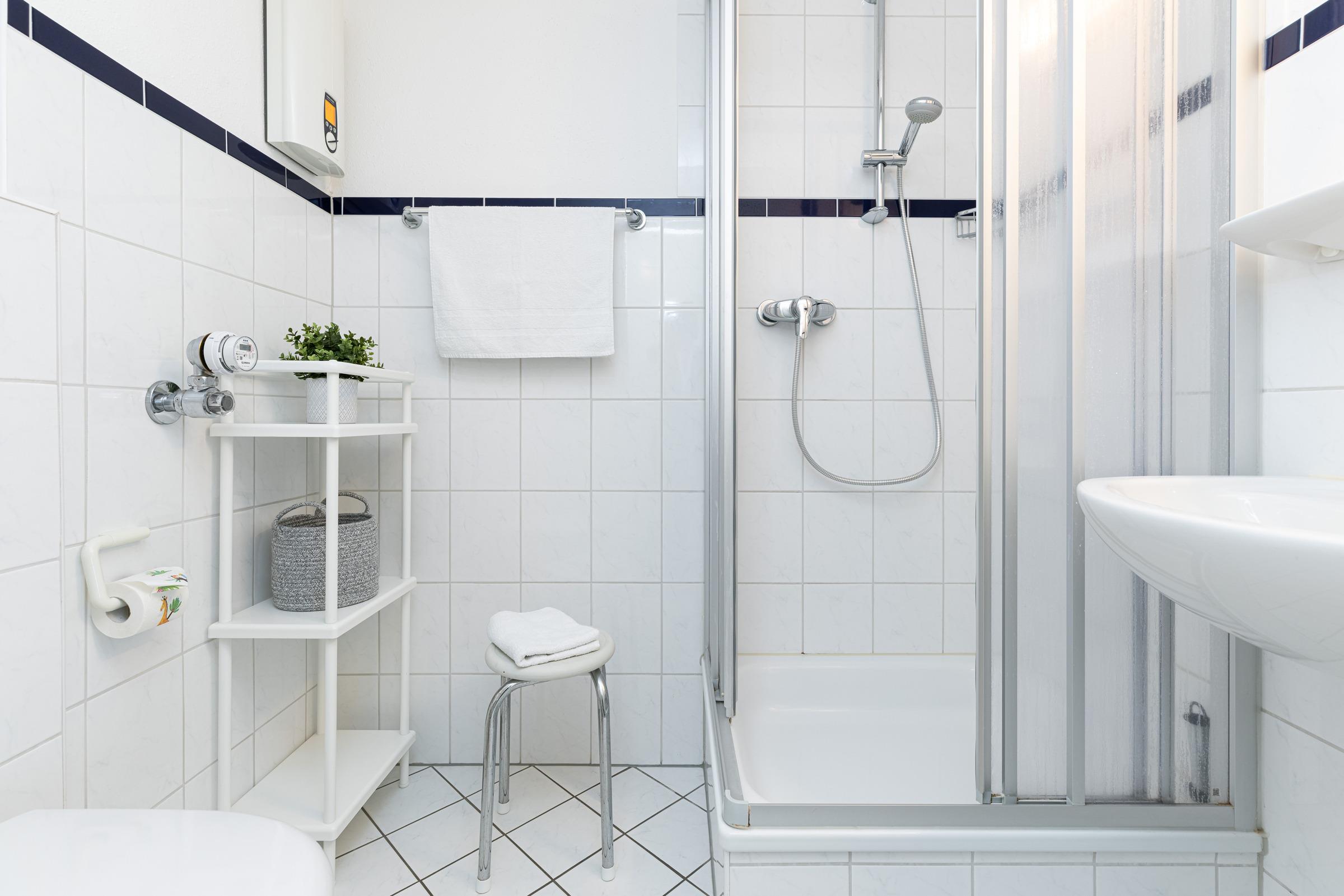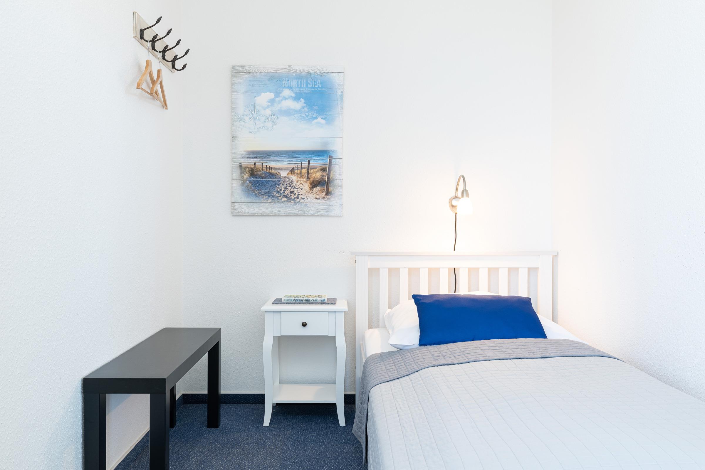 Die Wohnung teilt sich auf in eine Kochnische, ein Bad mit Dusche, einen Wohn-/Schlafraum mit Essecke und einen separaten Schlafraum mit 2 Einzelbetten. Vom Balkon aus können Sie zwischen den Häusern immer wieder einen Blick auf die Kieler Förde erhaschen.