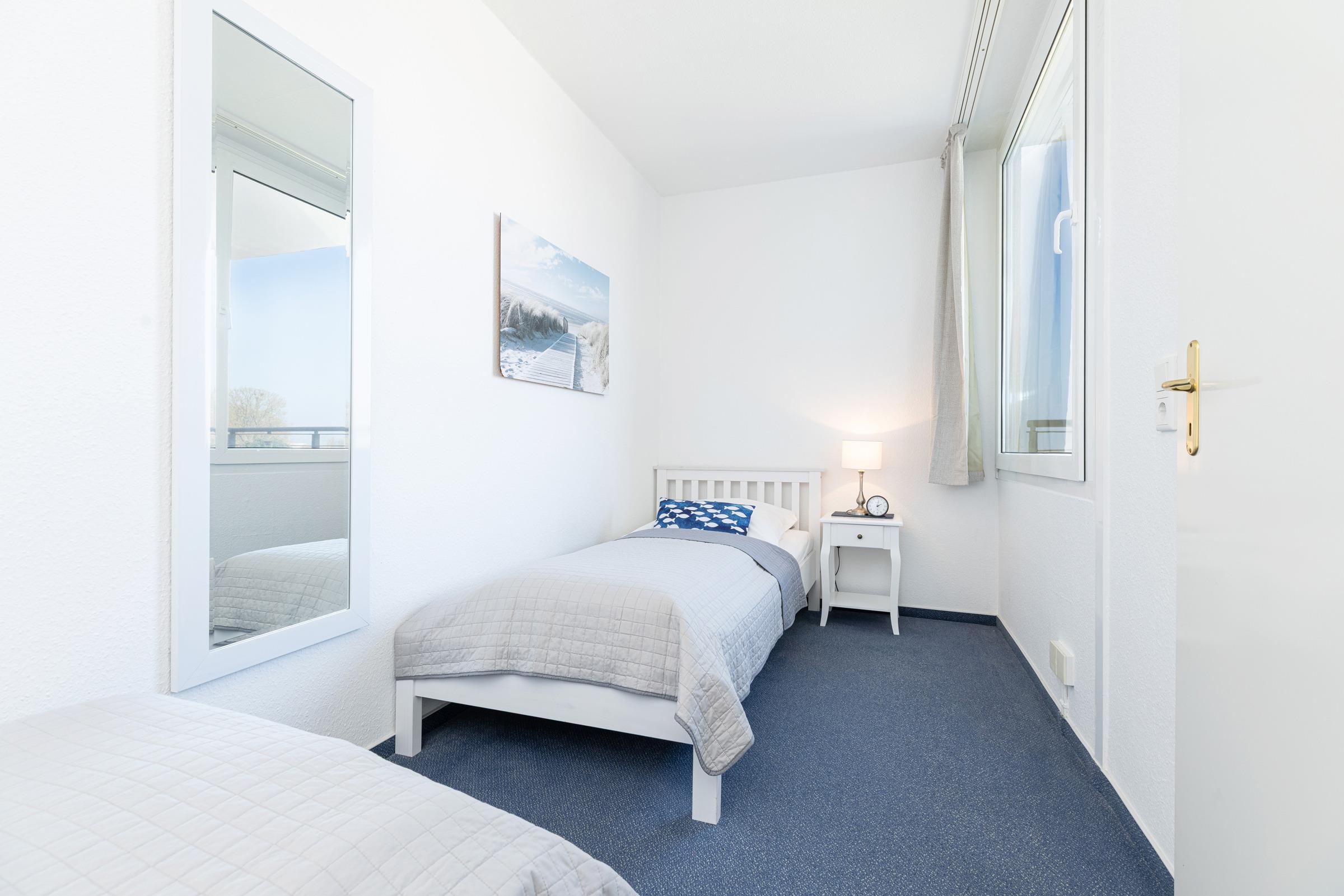 Schlafzimmer: 2 Einzelbetten (90x200 cm), Verdunkelung: Vorhänge, kein Platz für Babybett vorhanden