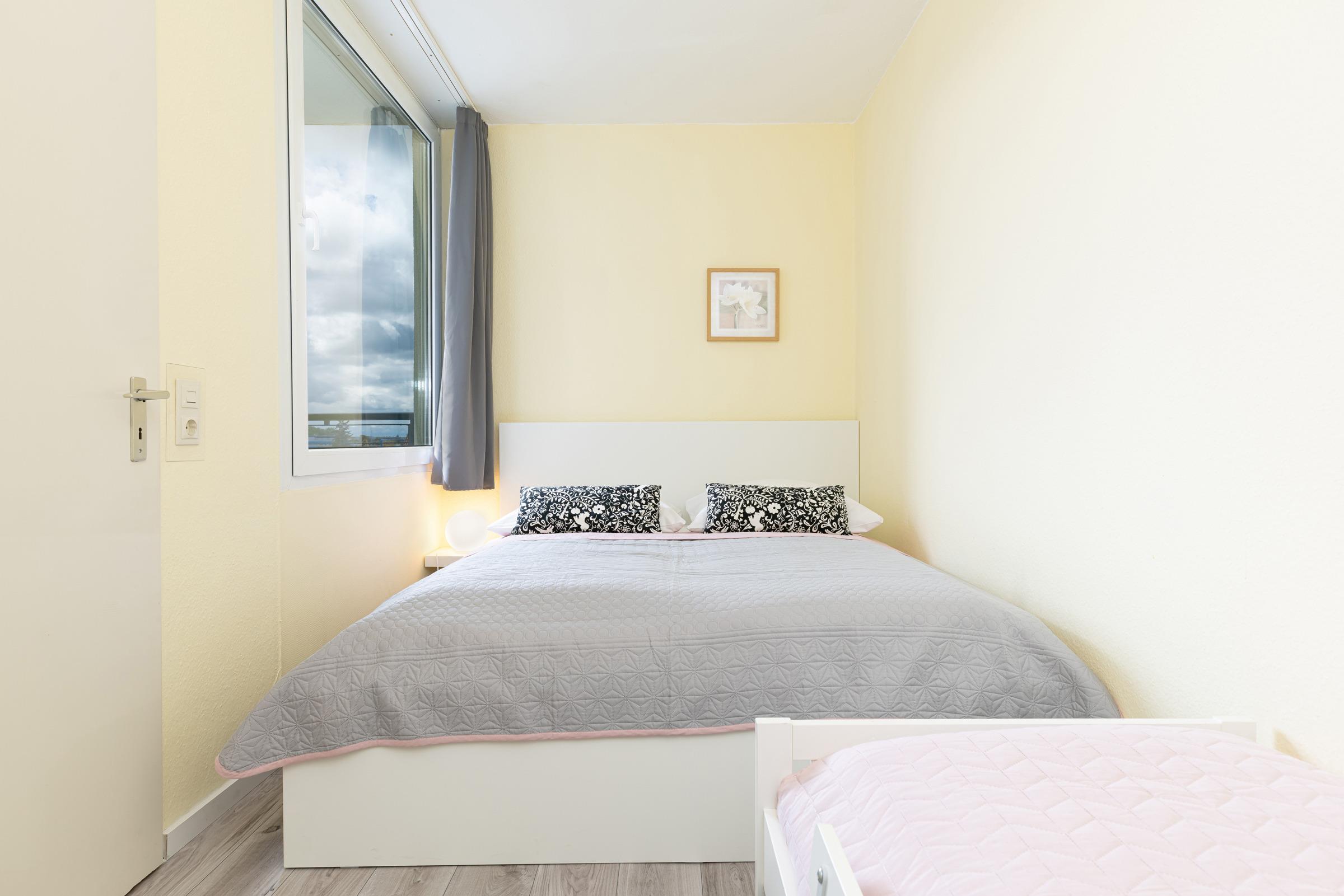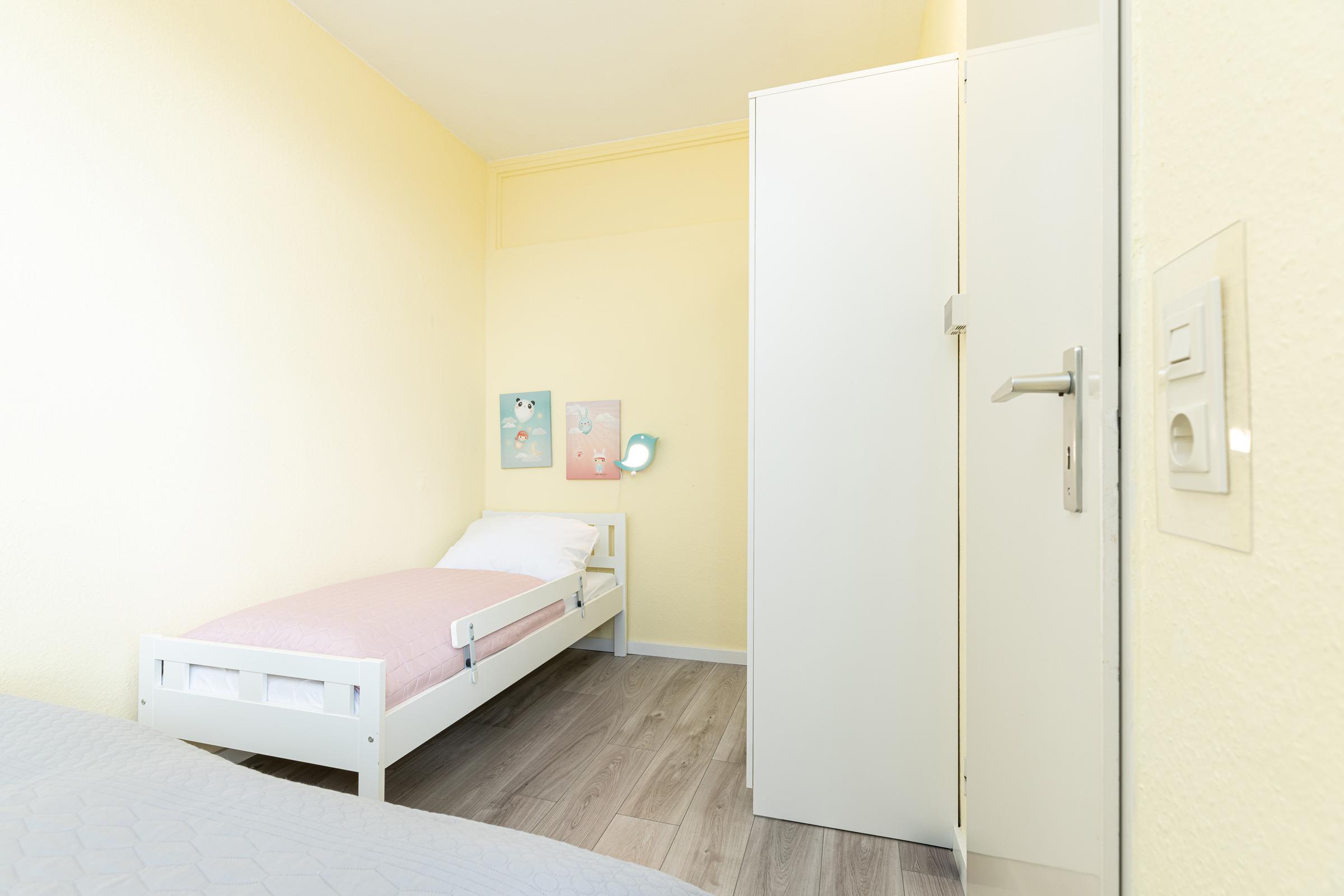 Schlafzimmer: Doppelbett (160x200 cm), Kinderbett (ca. 80x160 cm), Kleiderschrank, Verdunkelung: Vorhänge, kein Platz für Babybett vorhanden
