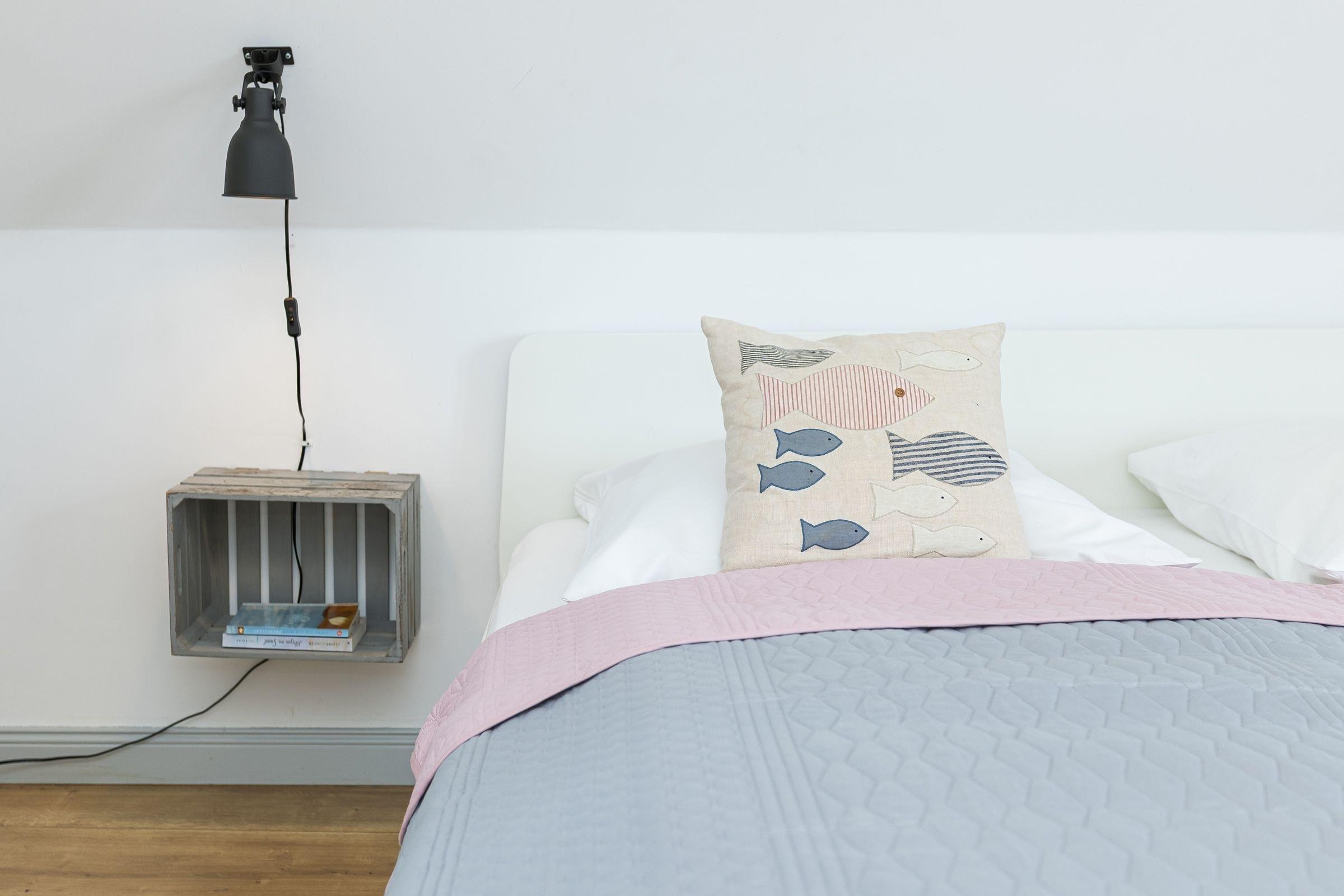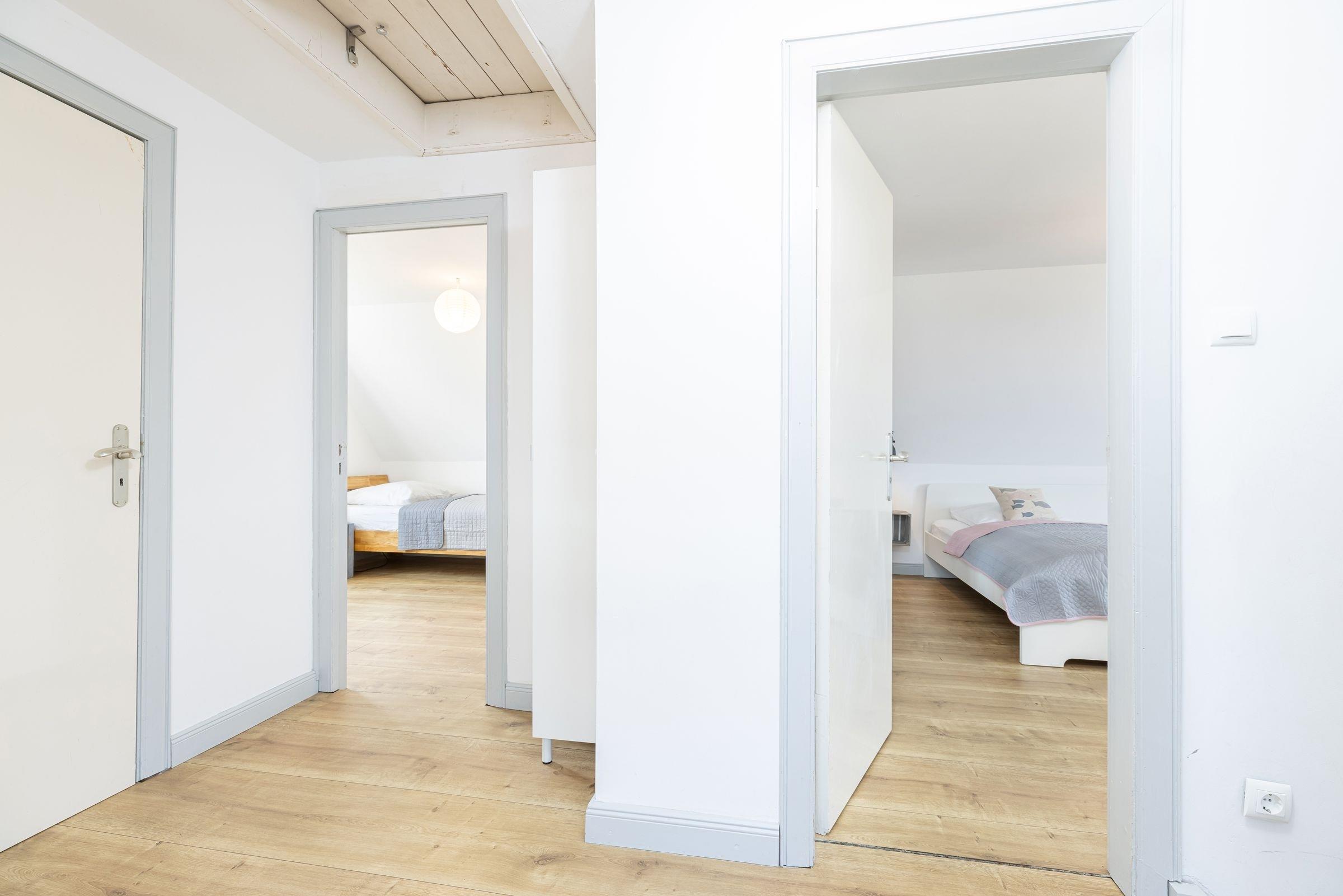 Im Erdgeschoss befinden sich 3 Zimmer, die miteinander verbunden sind. Die Küche ist mit einem Gas-Herd versehen und mit dem Essbereich verbunden. Es gibt im Anschluss ein Wohnzimmer mit Schlafcouch/ Sessel, einem TV mit DVBT-2 HD (Öffentlich-rechtliche + Private Programme in HD), großer Bücher- und DVD-Auswahl, Kaminofen und Zugang zur Terrasse, die eine herrliche Aussicht bietet. Zusätzlich ist ein Gäste-WC vorhanden. Das Bad im Dachgeschoss ist mit Dusche in der Schräge ausgestattet. Das Hauptschlafzimmer ist mit einem Doppelbett (180x200 cm), Kleiderschrank und Schreibtisch mit Fördeblick eingerichtet, das zweite Schlafzimmer verfügt über 2 Einzelbetten (je 90x200 cm).
