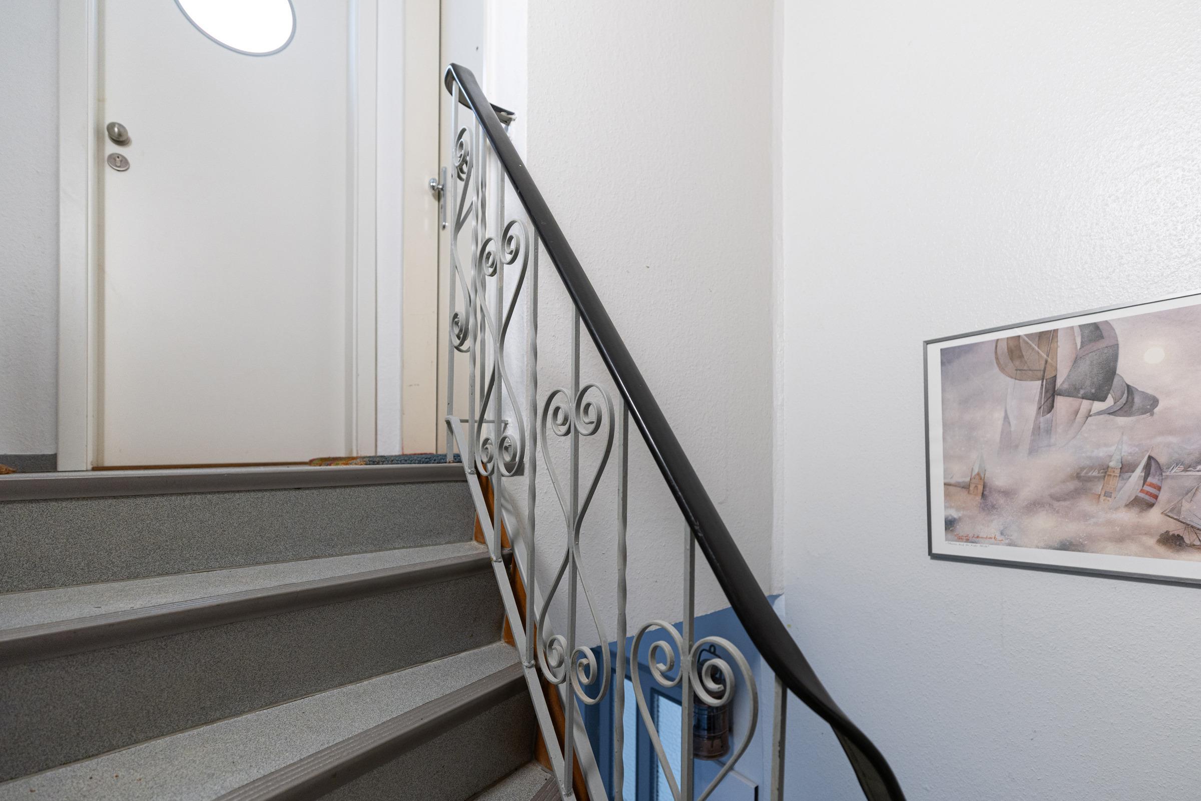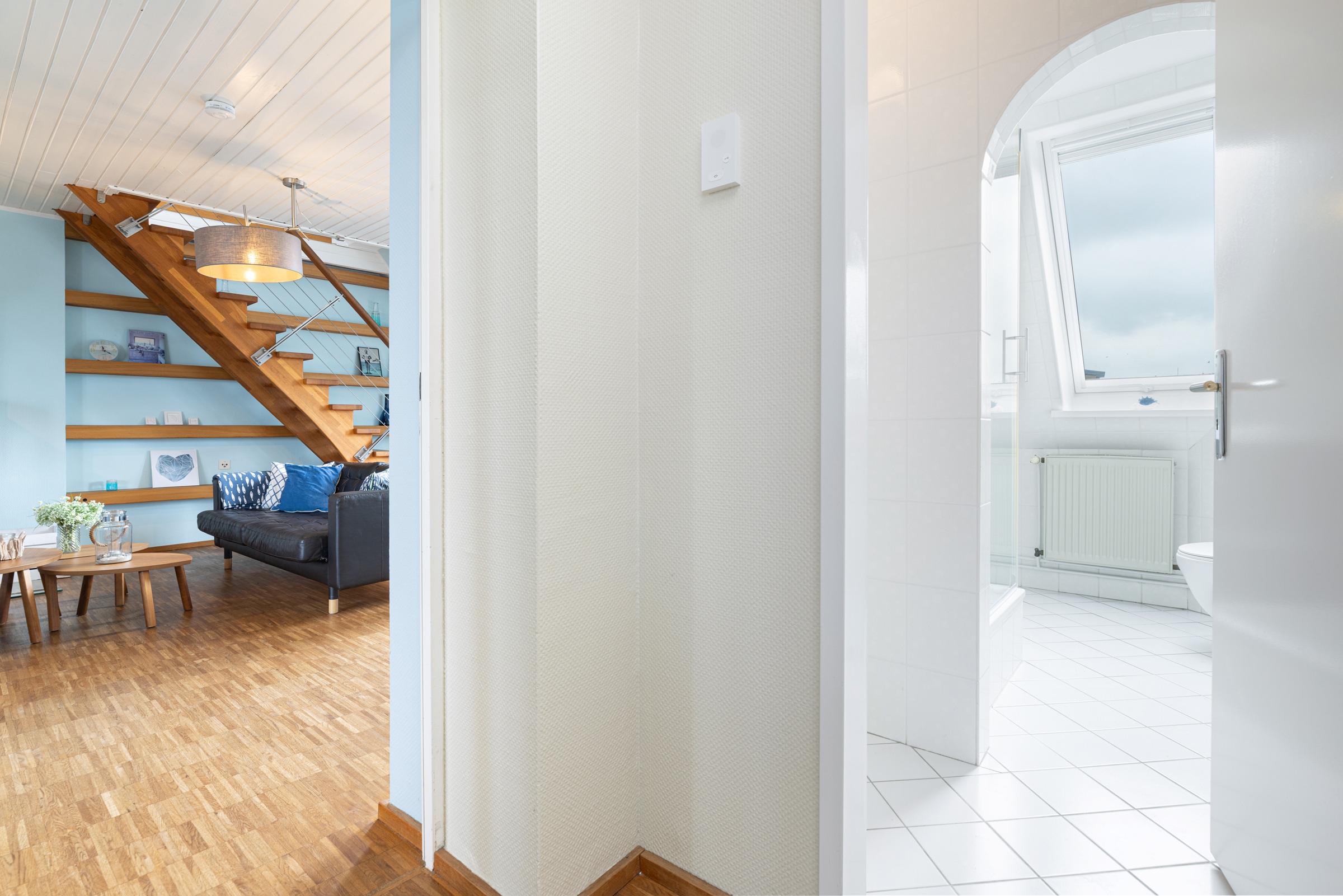 Die Wohnung ist komplett mit Holzfußboden ausgestattet. Die zwei geräumigen Bäder, eines mit einem Wannenbad, das andere mit Dusche sind frisch, hell und modern. Zum gemeinsam Kochen lädt die moderne Wohnküche ein. Ein charmanter Tresen für den "schnellen Kaffee", teilt die bestens ausgestattete Küche vom Essplatz. Ein Kinderhochstuhl für die kleinen Gäste steht bereit. Beim Frühstück mit Blick auf die Ostsee fängt der Tag schon mit Erholung an. Das geschmackvoll eingerichtete Wohnzimmer hat Zugang zum Balkon mit Lounge-Möbeln zum Ausruhen und Beobachten der vorbeiziehenden Segel- und Kreuzfahrtschiffe. Ein Fernglas liegt dafür für Sie bereit. An kühlen Abenden sorgt der Kamin für noch mehr Gemütlichkeit. Die 4 Schlafzimmer (eines davon ist ein Durchgangszimmer) im Dachgeschoss verfügen über Cabriofenster mit Austritt. Selbst aus den Doppelbetten kann man den herrlichen Ostseeblick genießen. Das große Schlafzimmer in der unteren Etage (ebenfalls mit Doppelbett ausgestattet) verfügt über einen 2. Fernseher und weiteren kleinen Balkon, auch hier hat man den herrlichen Panoramablick über die Ostsee.