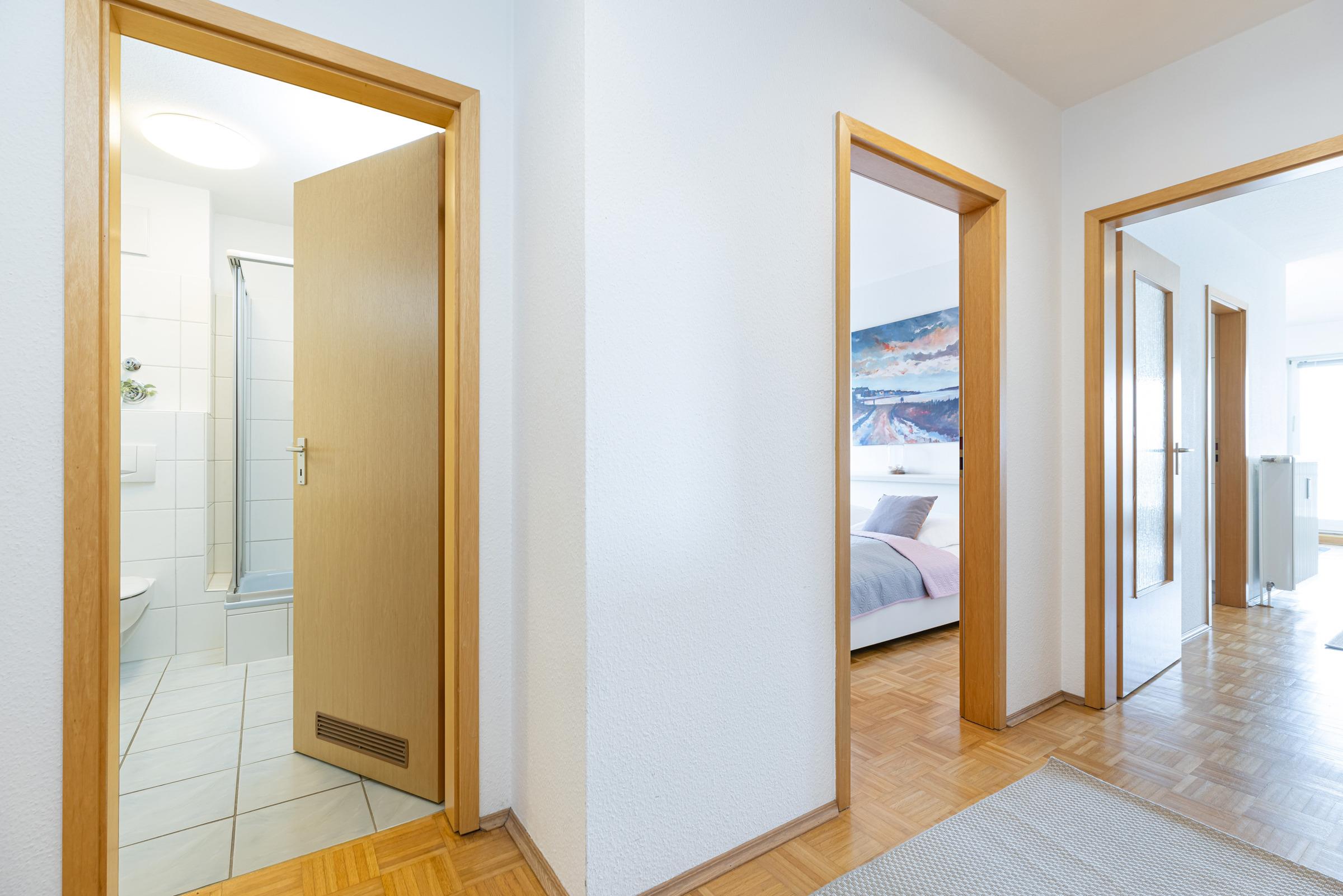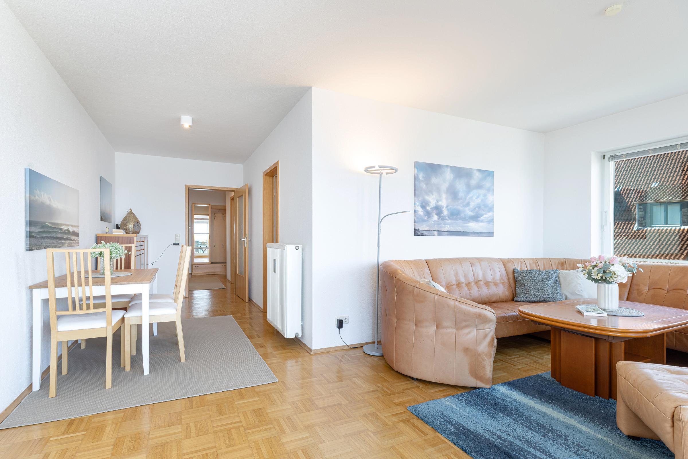 Dieses Feriendomizil ist für max. 3 Erwachsene ausgelegt. Die ca. 60m² große, lichtdurchflutete Ferienwohnung mit Balkon befindet sich in einem Mehrfamilienhaus in der 1. Etage und verfügt über ein Schlafzimmer mit Doppelbett, ein Wohnzimmer bestehend aus einer Eckcouchgarnitur und einem Sessel, Flachbild-TV und Zugang zum möblierten Balkon sowie eine separate Küche mit Essbereich. Für zwei kleine Gäste stehen Kinderreisebetten inklusive zur Verfügung.