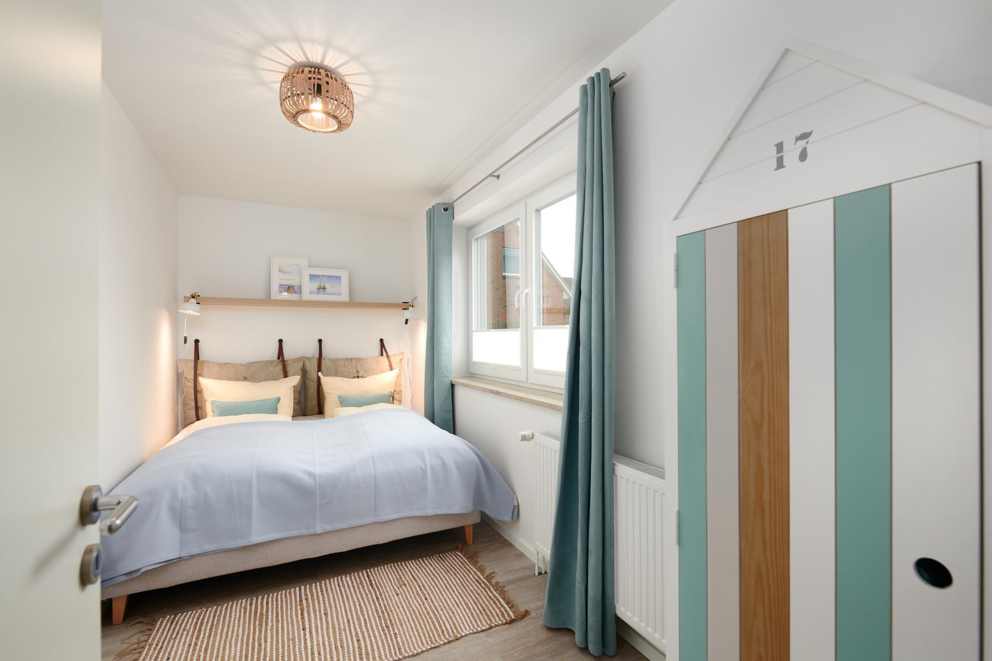 Schlafzimmer 1 (EG): 1 Doppelbett (2x 90x200 cm), Kleiderschrank, TV, Verdunkelung: Plissee und Gardinen, Platz für ein Babybett vorhanden