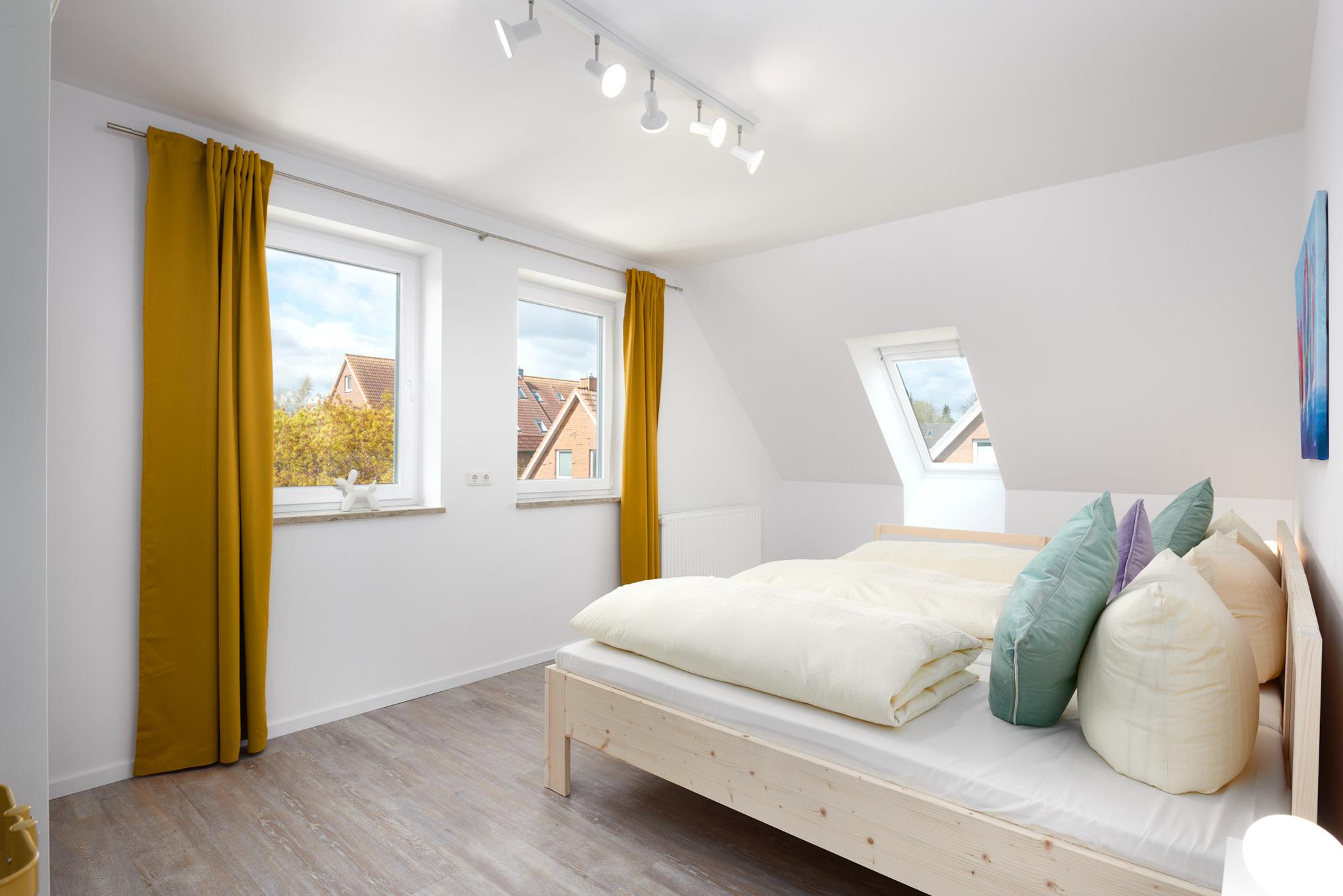 Schlafzimmer 2 (2. OG): 1 Doppelbett (2x 90x200 cm), Kleiderschrank, TV, Verdunkelung: Plissee und Gardinen, Platz für ein Babybett vorhanden