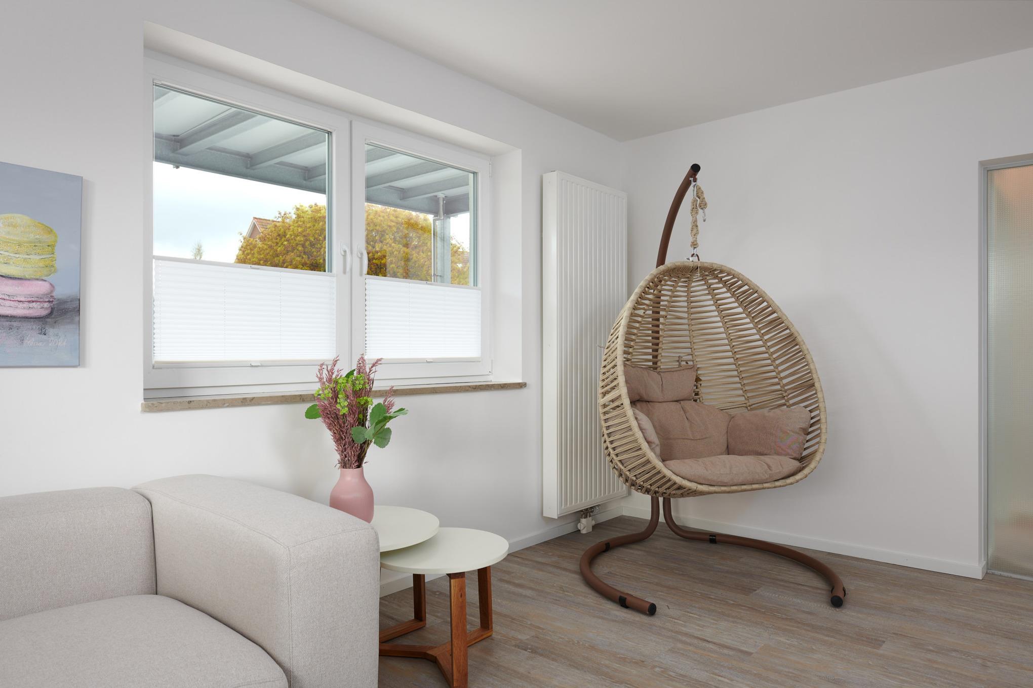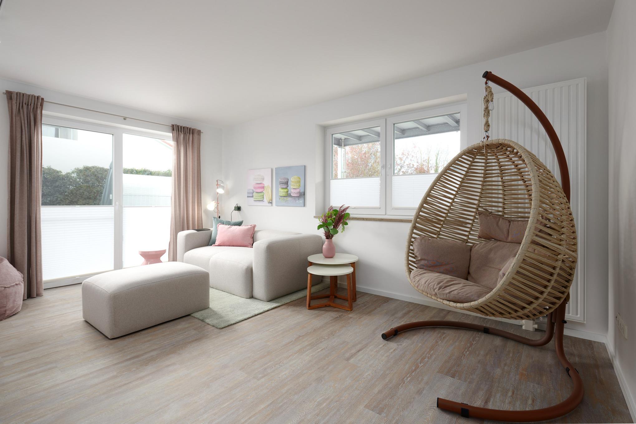 Die moderne Ferienwohnung überzeugt mit einem hellen Wohnbereich, der mit gemütlichem Sofa und großem Flachbild-TV zum Entspannen einlädt. Von hier gelangen Sie auf die sonnige Terrasse mit nordöstlicher Ausrichtung, die mit Gartenmöbeln und einem Strandkorb ausgestattet ist und auch das Grillen erlaubt. Die offene Küche bietet alles, was Sie im Urlaub benötigen: Geschirrspüler, Backofen, Induktionskochfeld, Kühlschrank mit Gefrierfach, Kaffeemaschine und viele weitere Annehmlichkeiten. Am Esstisch finden alle Gäste bequem Platz. Zwei separate Schlafzimmer mit komfortablen Doppelbetten sorgen für erholsame Nächte. Das Tageslichtbad ist modern ausgestattet mit bodengleicher Dusche, WC, beleuchtetem Kosmetikspiegel und Haartrockner.