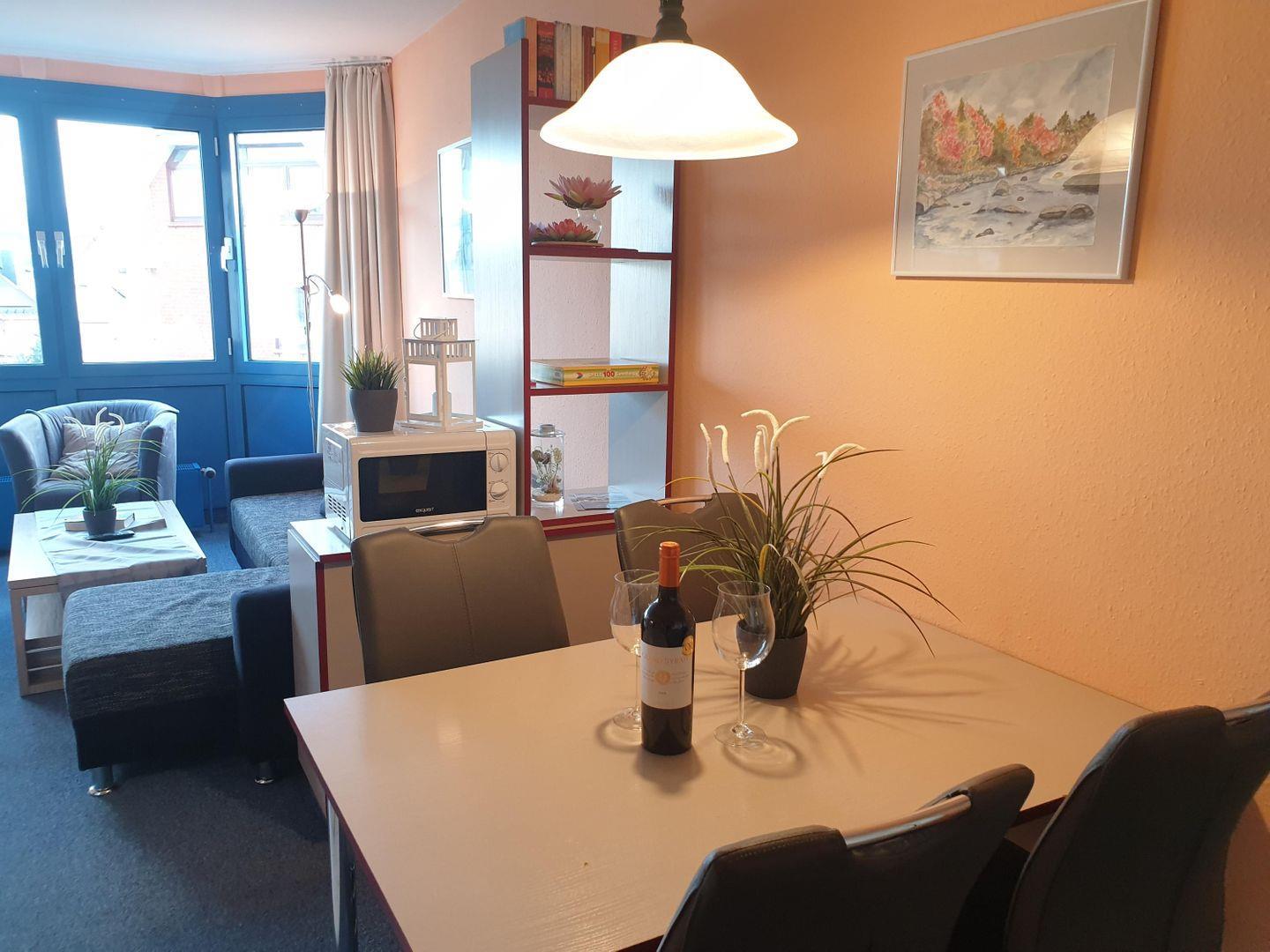 Ferienwohnung "Panorama 14": 2-Zimmer-Wohnung über 30 m² im ersten Stock für bis zu 3 Personen: Wohn-Schlafzimmer mit Doppelschlafcouch und TV, offene Küchenzeile mit angrenzendem Essplatz, Badezimmer mit Dusche und WC, Schlafzimmer mit Doppelbett und TV, WLAN, Pkw-Stellplatz ca. 400 m entfernt