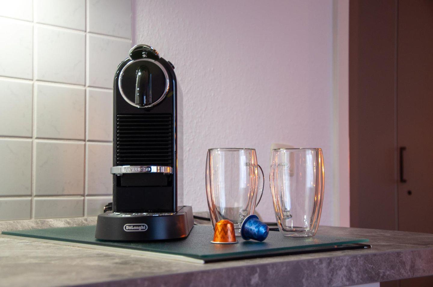 Die Küchenzeile ist mit einem Ceranfeld mit zwei Kochplatten, einer Mikrowelle, einem Kühlschrank mit Gefrierfach sowie dem nötigen Geschirr und Küchenutensilien ausgestattet. So kannst du dir auch im Urlaub unkompliziert etwas zubereiten, ob Frühstück, Snack oder Abendessen.