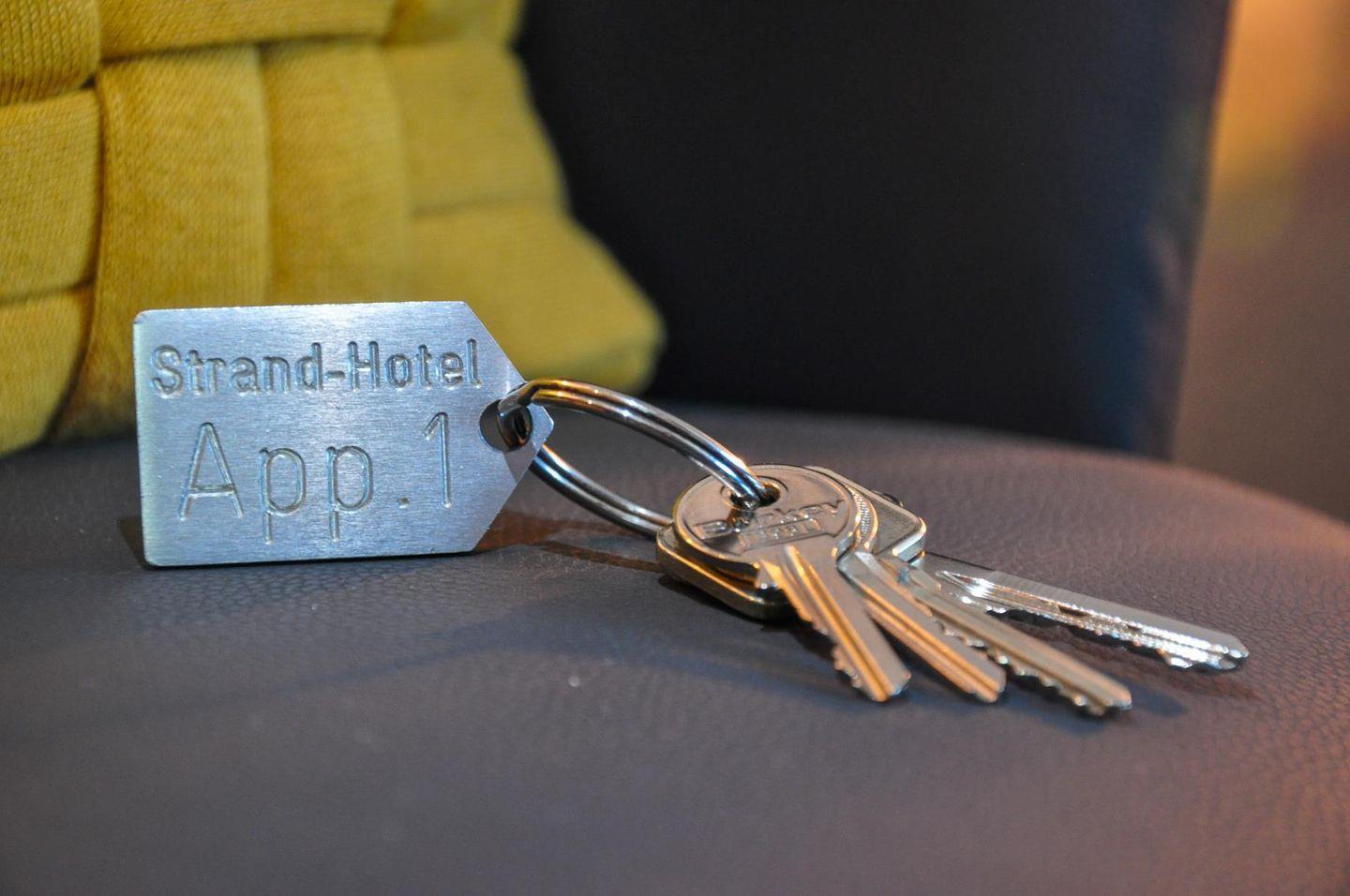 Strandhotel 1: Charmantes 1-Raum-Apartment in der Hochparterre, ca. 28?m², für 1–2 Personen. Kombinierter Wohn-/Schlafraum mit Doppelbett, Essplatz, HD-TV und Zugang zum Balkon (Landseite). Küchenzeile mit Ceranfeld (2 Platten), Mikrowelle, Kühlschrank mit Gefrierfach. Bad mit Dusche, Kosmetikspiegel und Föhn. WLAN, Zentralheizung. Gemeinschaftlicher Aufenthaltsraum mit Meerblick im Haus. Gemeinschaftlicher HWR mit Waschmaschine und Trockner (Münzeinwurf). Kostenloser Außenstellplatz ca. 250?m entfernt. Nur 20?m zum Strand, Promenade, Restaurants und Einkaufsmöglichkeiten fußläufig erreichbar. Nichtraucher, keine Haustiere.