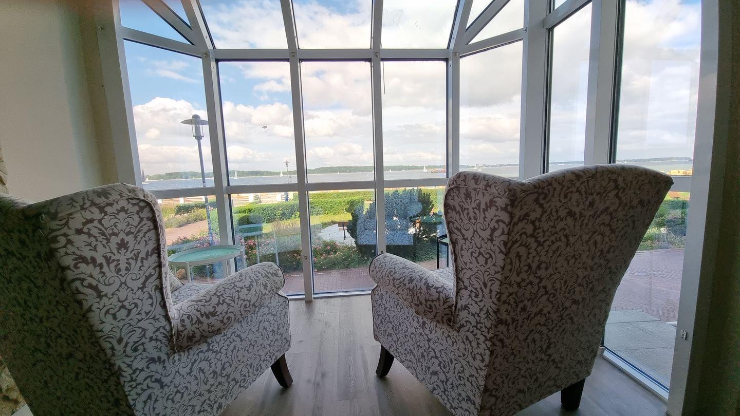 Ein besonderes Extra ist der gemeinschaftliche Aufenthaltsraum im Haus. Hier laden gemütliche Sitzgruppen und Ohrensessel zum Verweilen ein. Große Fenster bieten einen schönen Blick auf die Promenade, den Strand und die Förde. Ob du ein Buch liest, Gesellschaftsspiele nutzt oder einen Film auf dem Flatscreen-TV schaust – dieser Raum bietet dir zusätzliche Entspannung mit maritimer Kulisse.