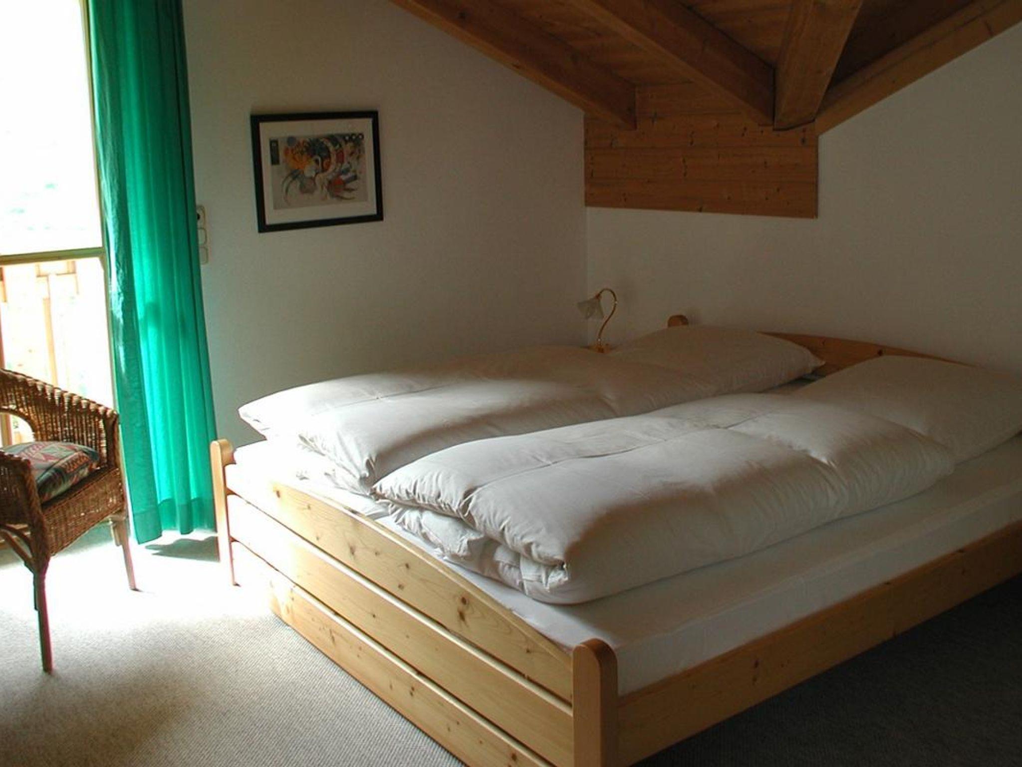 Im Apartment 1 liegen Wohn- und Schlafzimmer auf einer Ebene. Um das Apartment verläuft ein Balkon. Über die anschließende Terrasse gelangt man auf die Liegewiese. Das Apartment hat Morgen und Abendsonne.