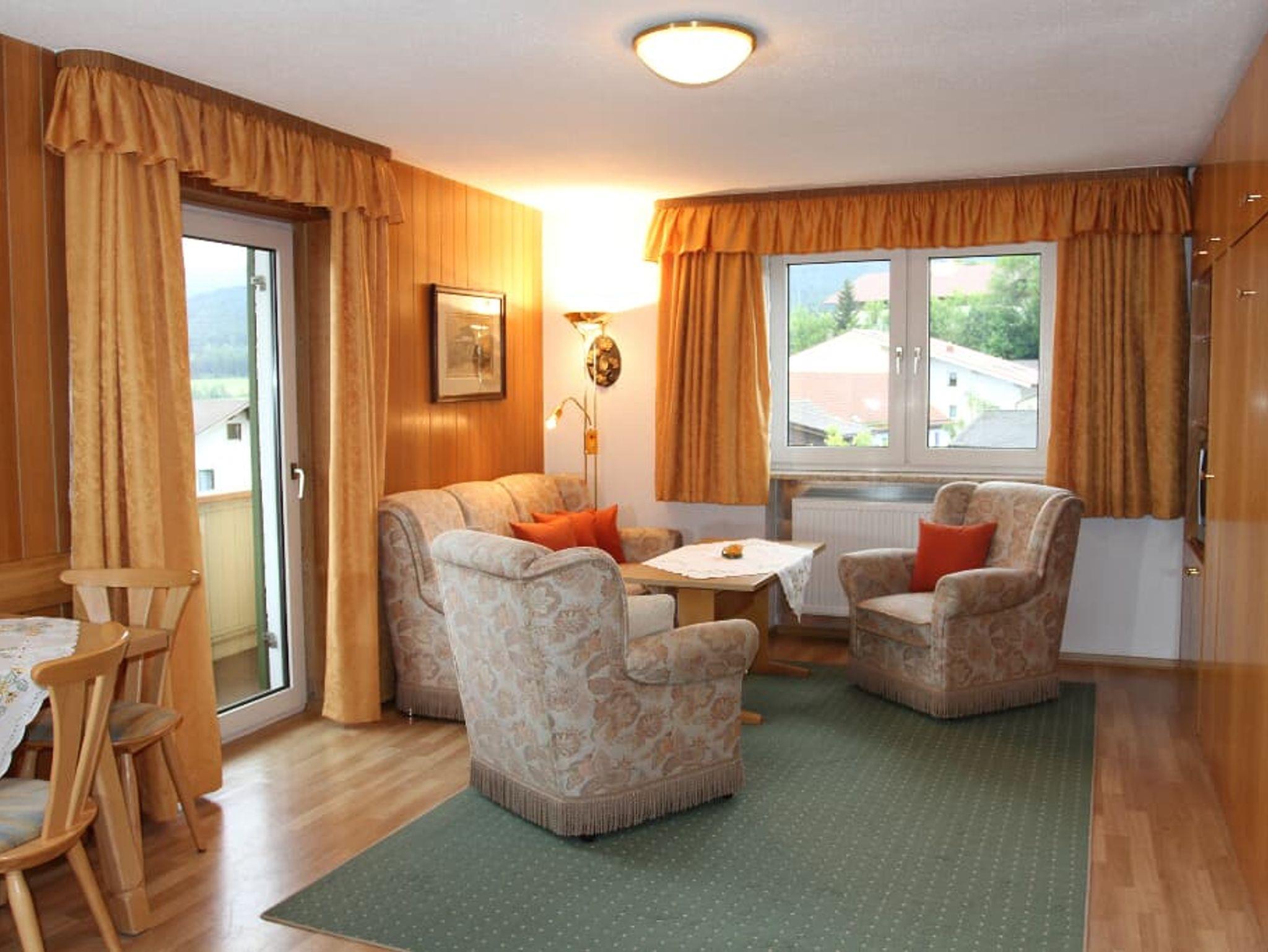 1-Zimmerappartement mit Küchenzeile, Essbereich und Balkon mit Blick zum Weltcupberg Arber