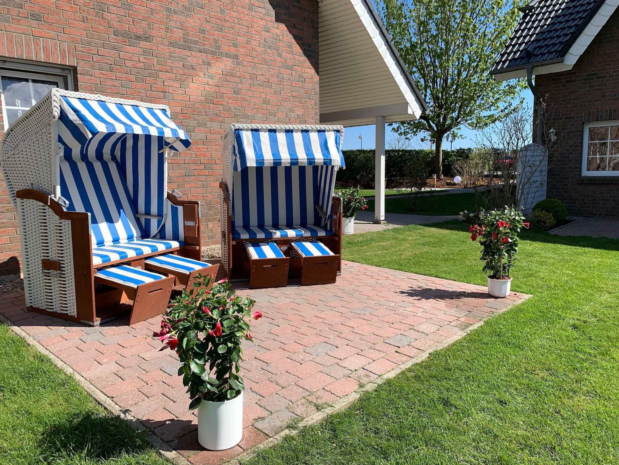 Die große Gartenanlage fügt sich harmonisch in die Landschaft ein und bietet viel Platz zum Erholen, Entspannen und Spielen. Im Garten befinden sich Terrassen mit Sitzgruppen, Strandkörbe, eine Liegewiese, Liegestühle und Sonnenschirme. Außerdem gibt es einen Grillplatz und einen Kinderspielplatz.