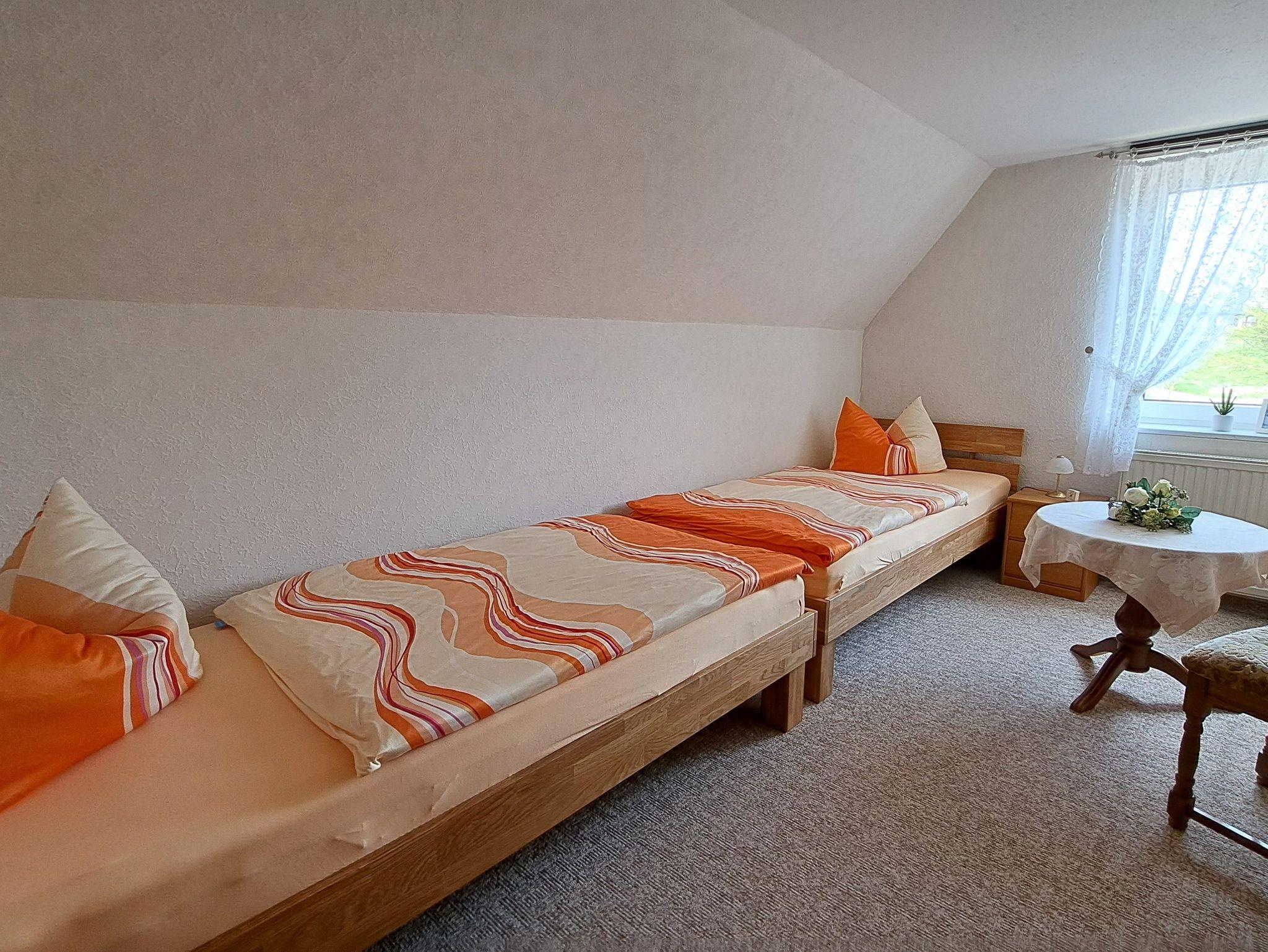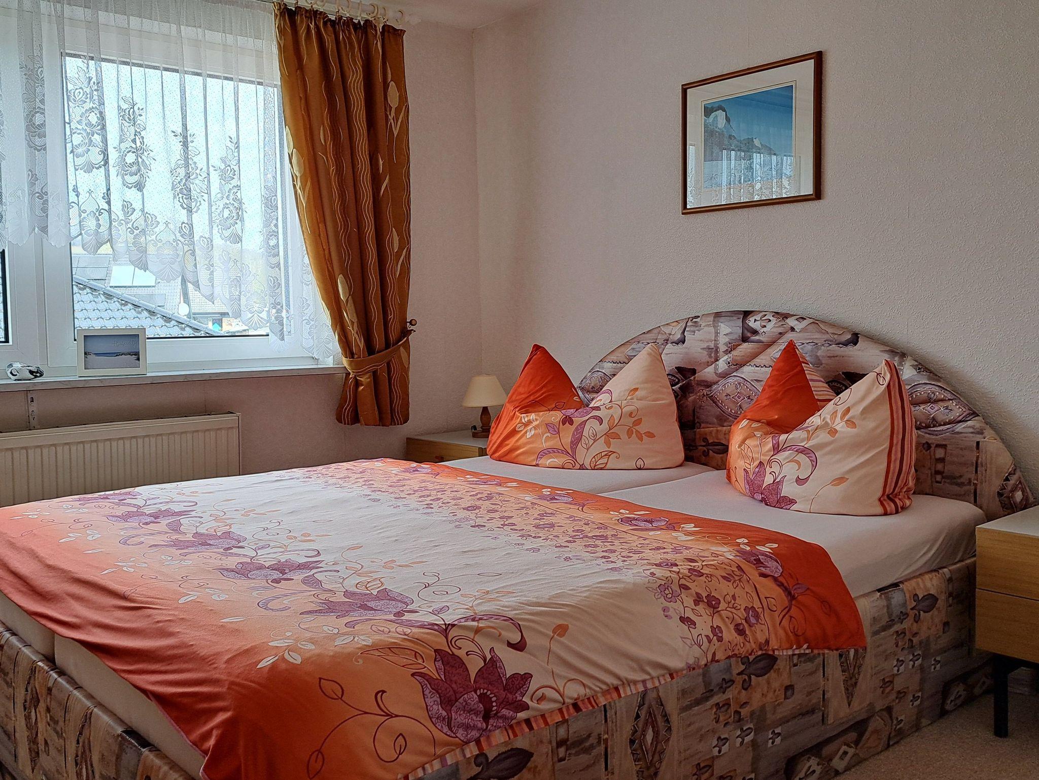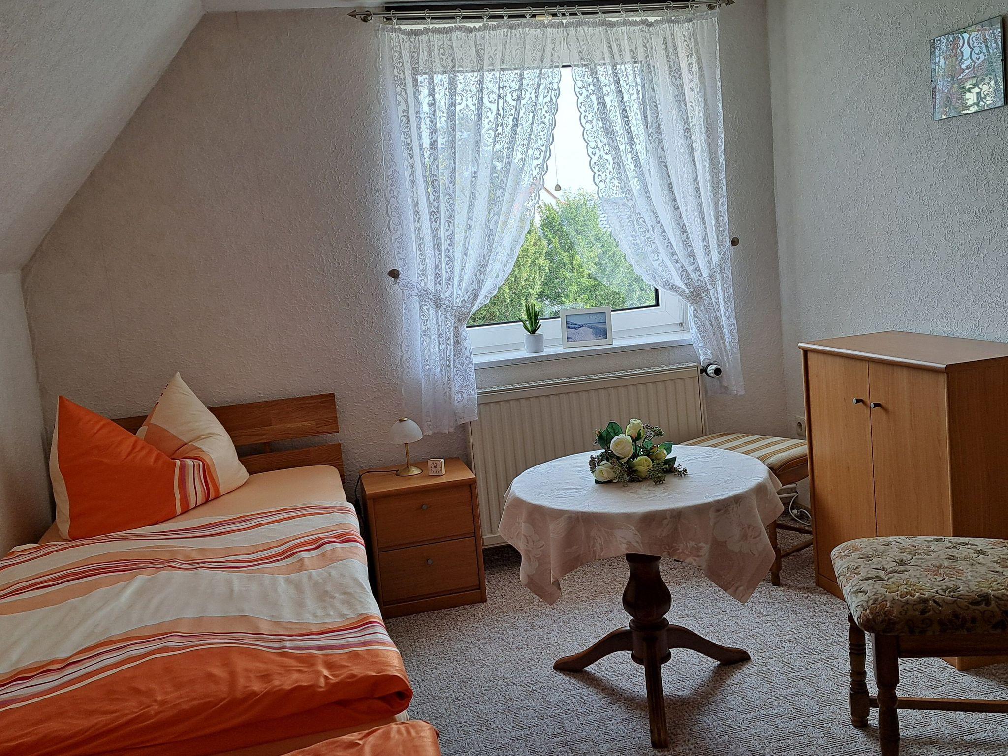 Die gemütlich 75qm große Ferienwohnung befindet sich in der ersten Etage eines Doppelhauses. Sie verfügt über einen Wohnraum mit Radio und TV, zwei separate Schlafräume, eine modern ausgestattete Küche, sowie Dusche/WC. Eine Terrasse in Süd/Westlage mit Gartenmöbeln lädt bei Sonnenschein zum Verweilen ein. Die Erstausstattung der Bettwäsche stellt der Vermieter Ihnen kostenlos zur Verfügung, bitte bringen Sie die Handtücher mit, ein PKW-Stellplatz ist auf dem Grundstück . Bitte erst ab 15.00 Uhr anreisen.