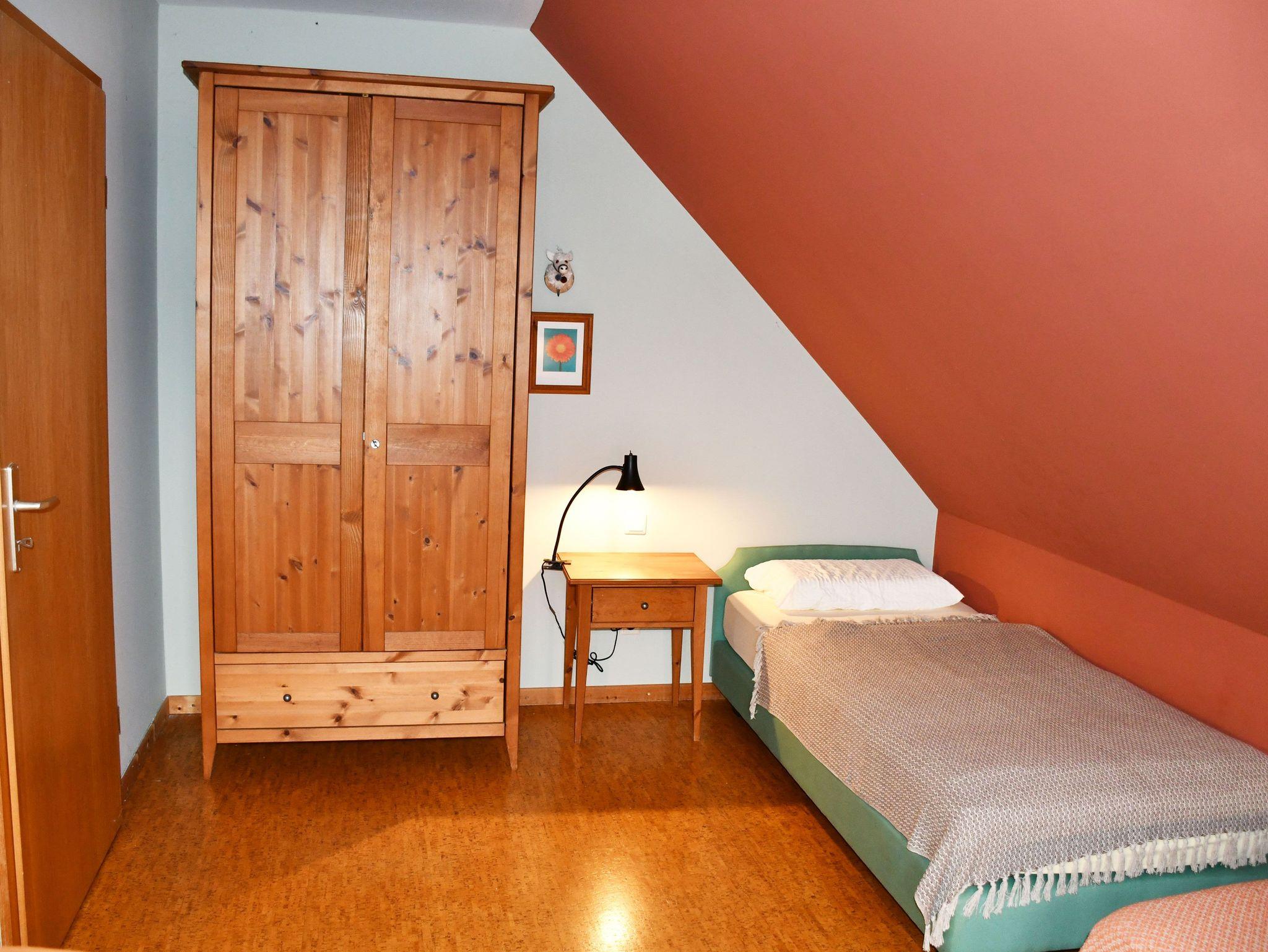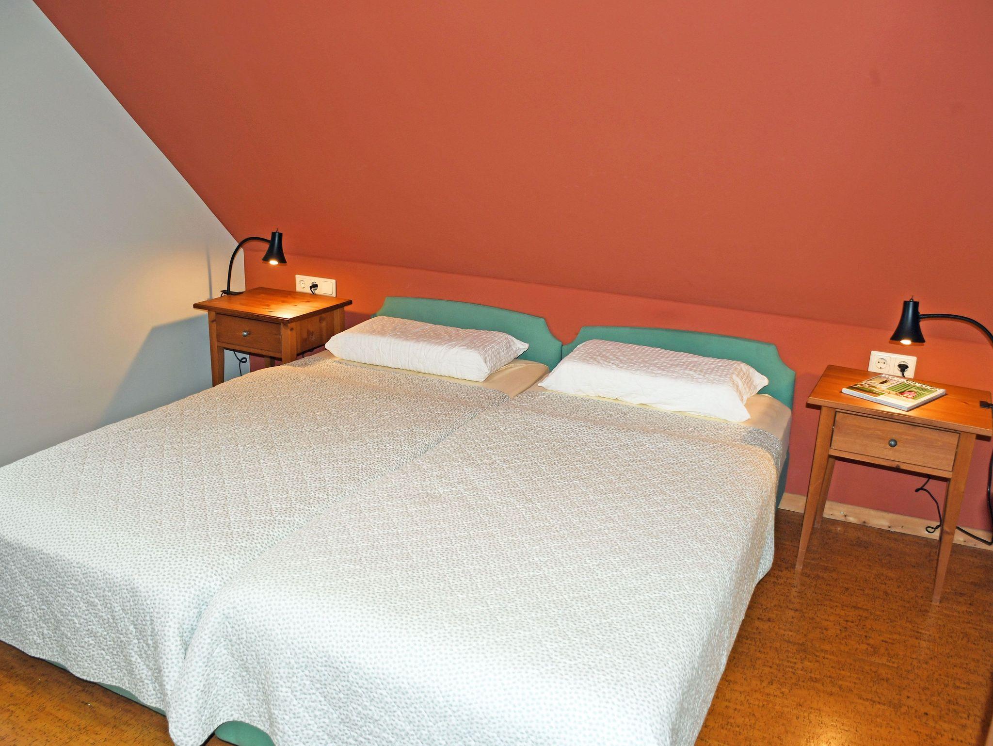 Die beiden Schlafzimmer befinden sich im Obergeschoss, das über eine Holztreppe erreichb ar ist.