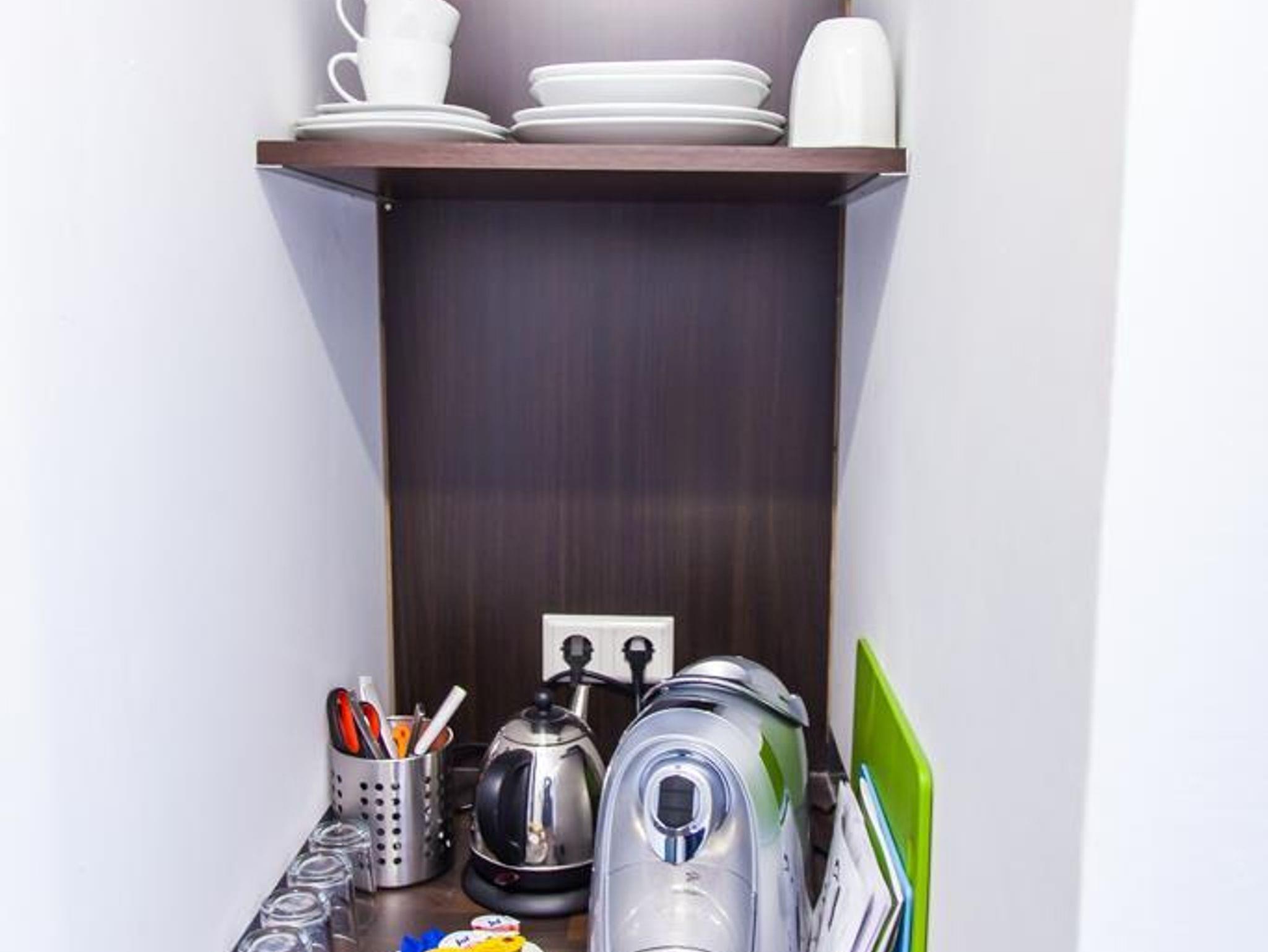 Alle Zimmer sind ausgestattet mit Kühlschrank, Kaffee- und Teezubehör, Wasserkocher, Kaffeemaschine, Küchenutensilien. Die Apartments verfügen außerdem über eine funktional ausgestattete Küchenzeile, die Ihnen die Möglichkeit bietet, sich Mahlzeiten selbst zuzubereiten. Das ganze Haus ist rauchfrei und mit kostenlosem WLAN ausgestattet.