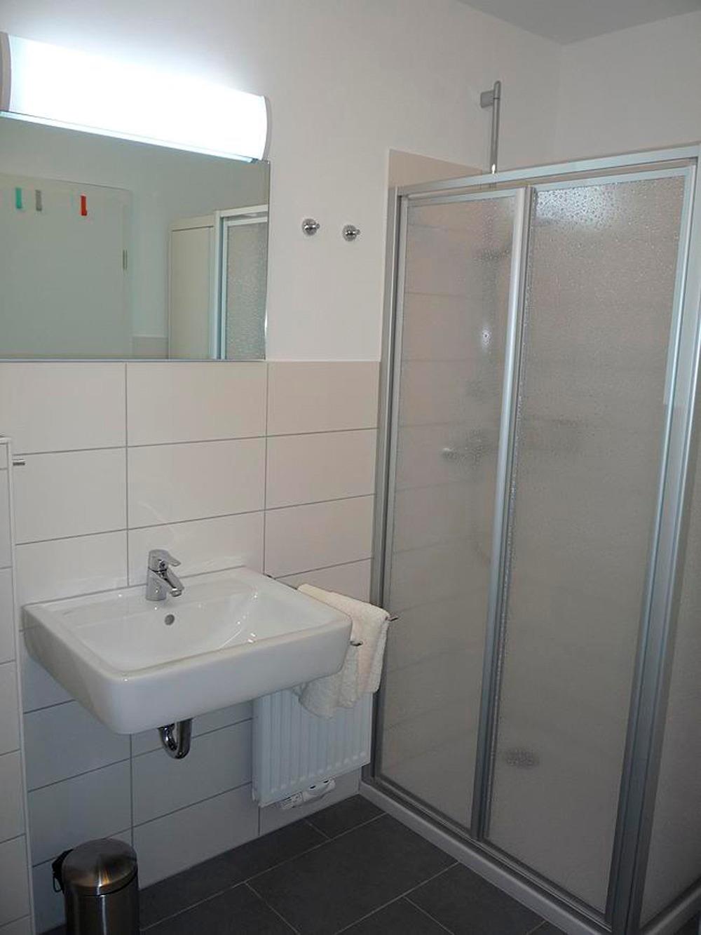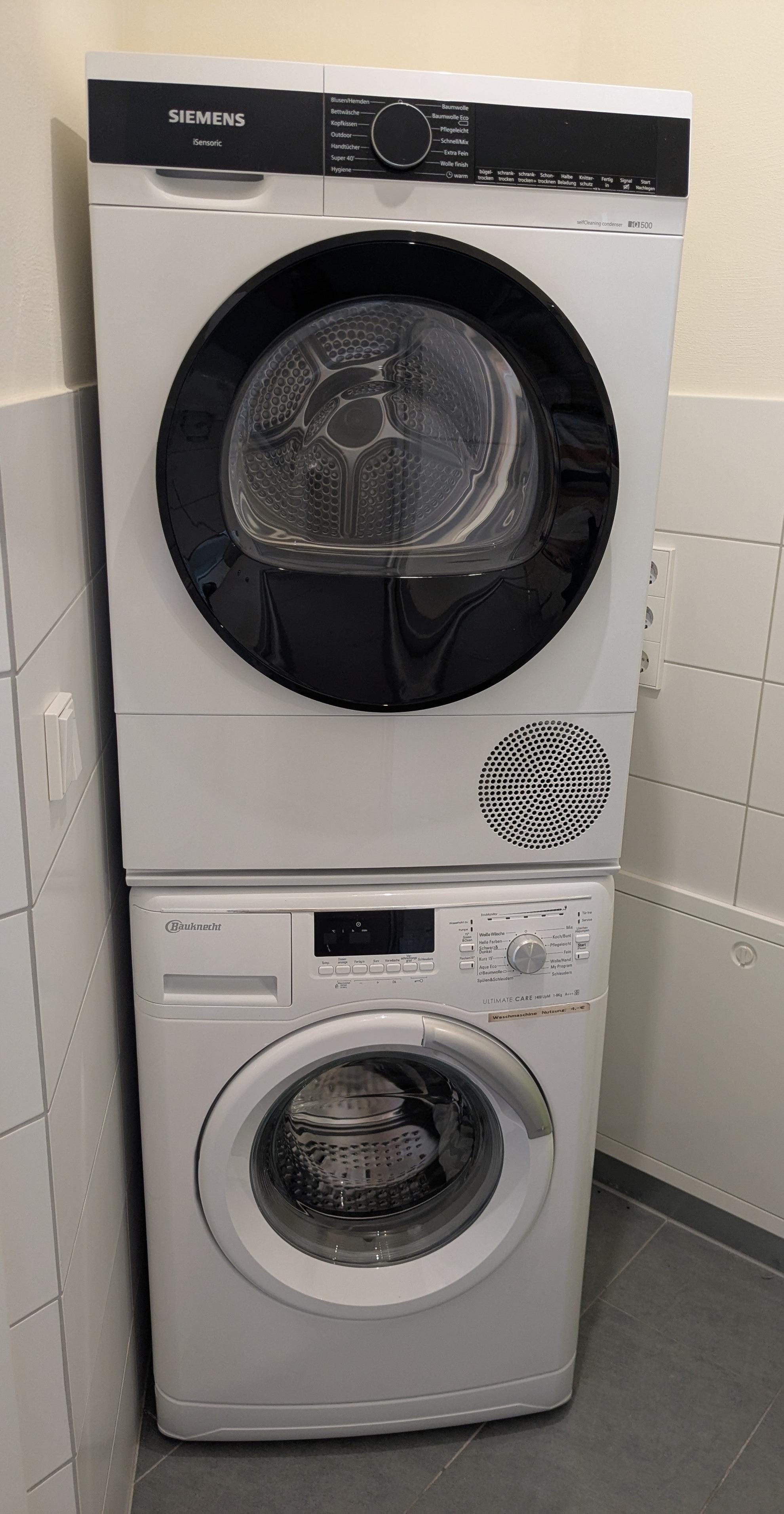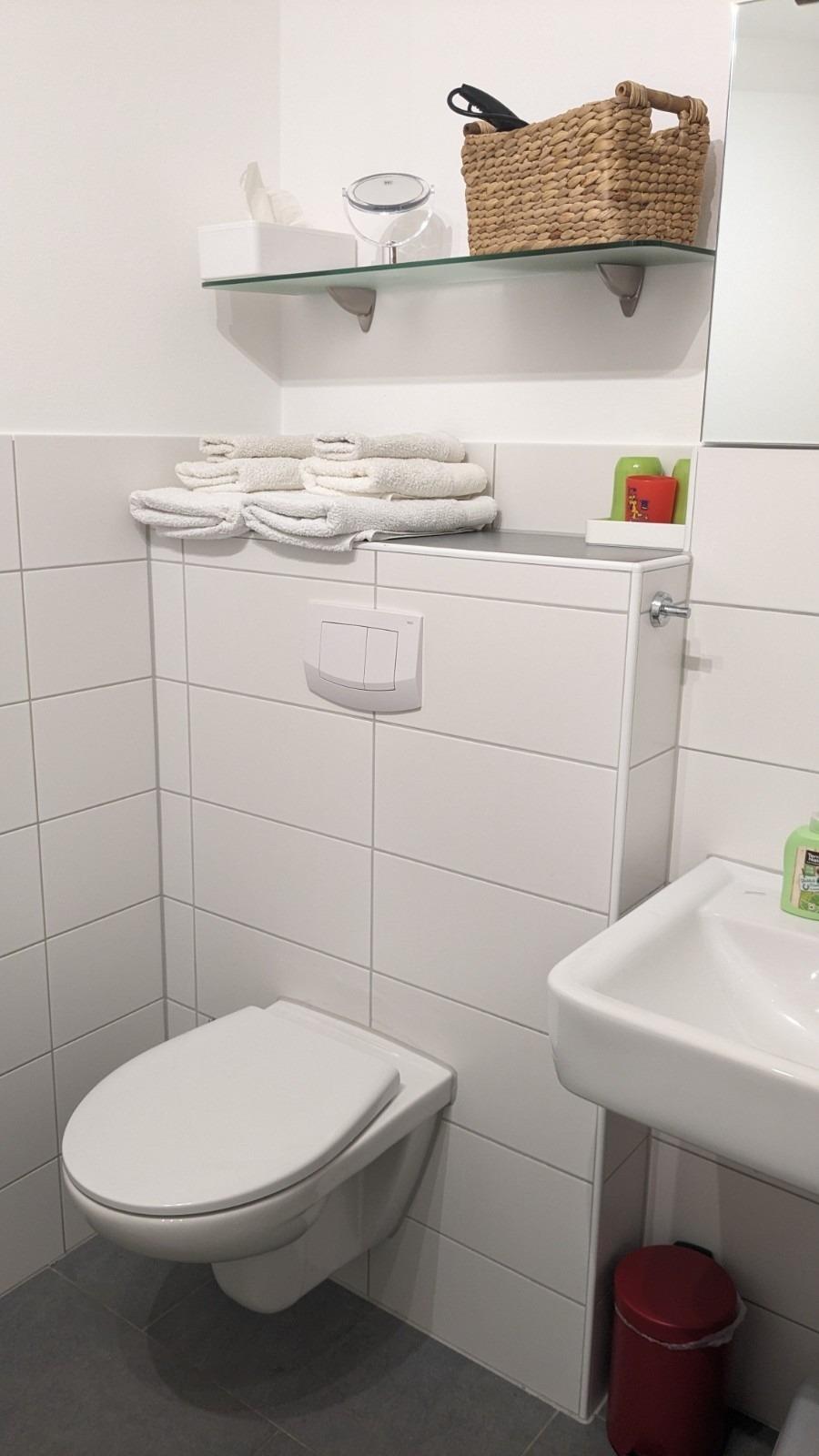 Badezimmer mit viel Ablagefläche, flauschigen Handtüchern, eine (fast) ebenerdige Dusche, erhöhtes WC, Kosmetikspiegel, Fön, eigene Waschmaschine (gegen Gebühr) und Fussbodenheizung.