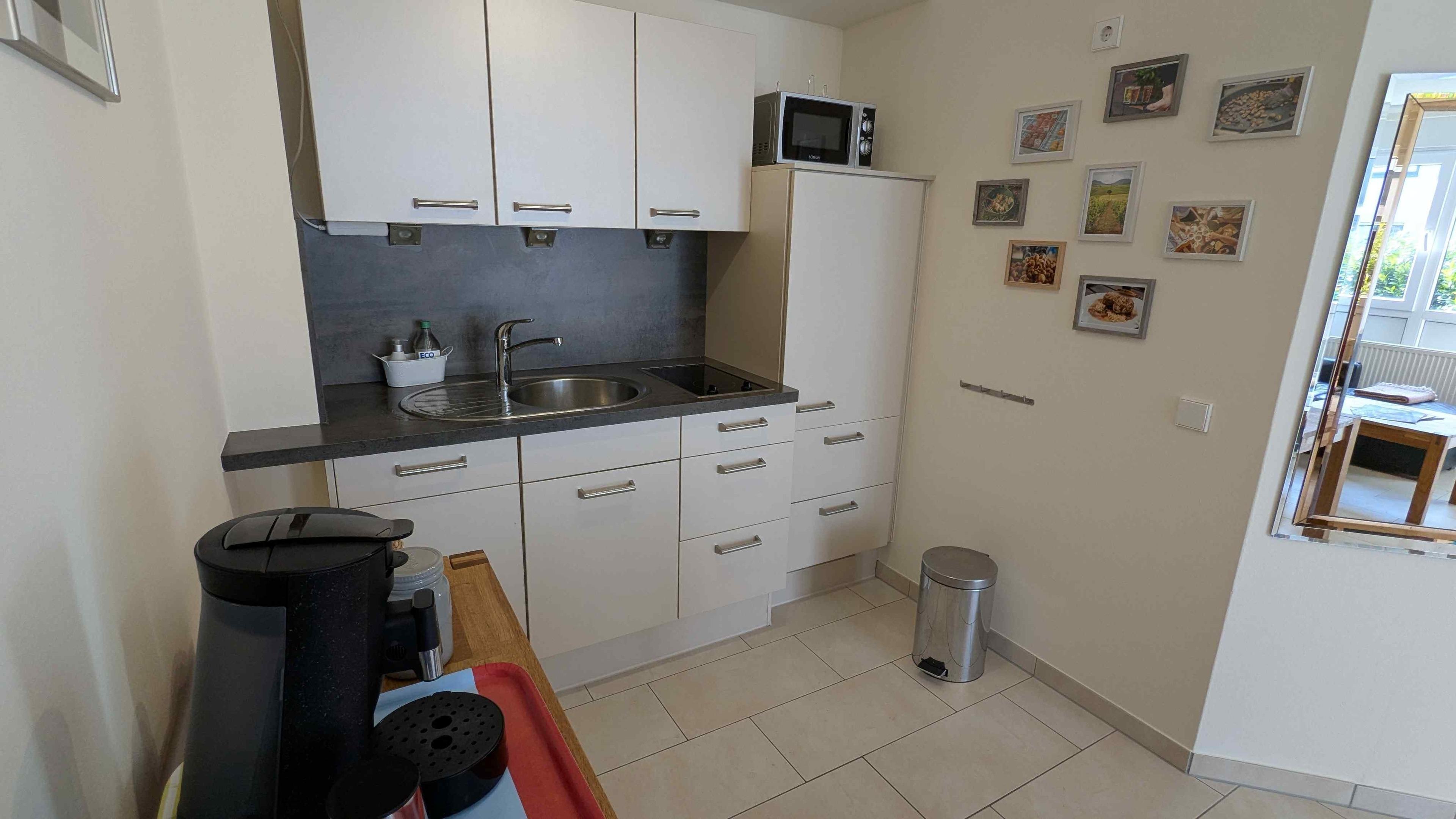 Moderne Einbauküche, komplett ausgestattet inkl. Spülmaschine, Glaskeramik-Kochfeld, Mikrowelle, Senseo-Kaffeemaschine und Wasserkocher. Esstisch mit Sitzgelegenheit für 4 Personen und bei Bedarf zusätzlich 2 Kinderhochstühle.