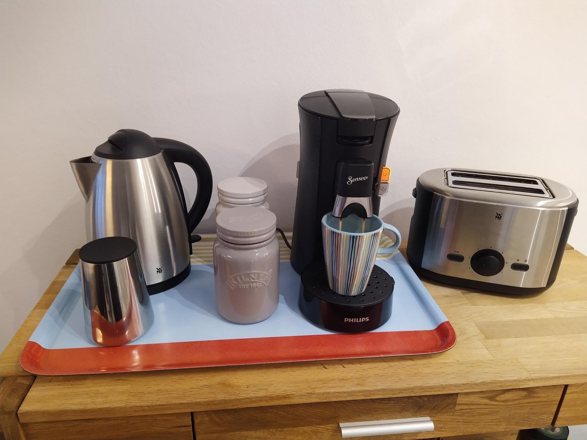 Ausreichend Geschirr und Besteck, damit die Spülmaschine gut gefüllt werden kann. Senseo-Kaffeemaschine, Wein- und Sektgläser, Weinkühler, Toaster, Mikrowelle. Handtücher, Bettwäsche, Allergiker-Betten, Geschirrtücher. Waschmaschine, Wäscheständer, Bügelbrett, Bügeleisen, Staubsauger. Toilettenpapier, Kosmetiktücher, Spülmittel, Seife, Reinigungsutensilien, Kofferablage.