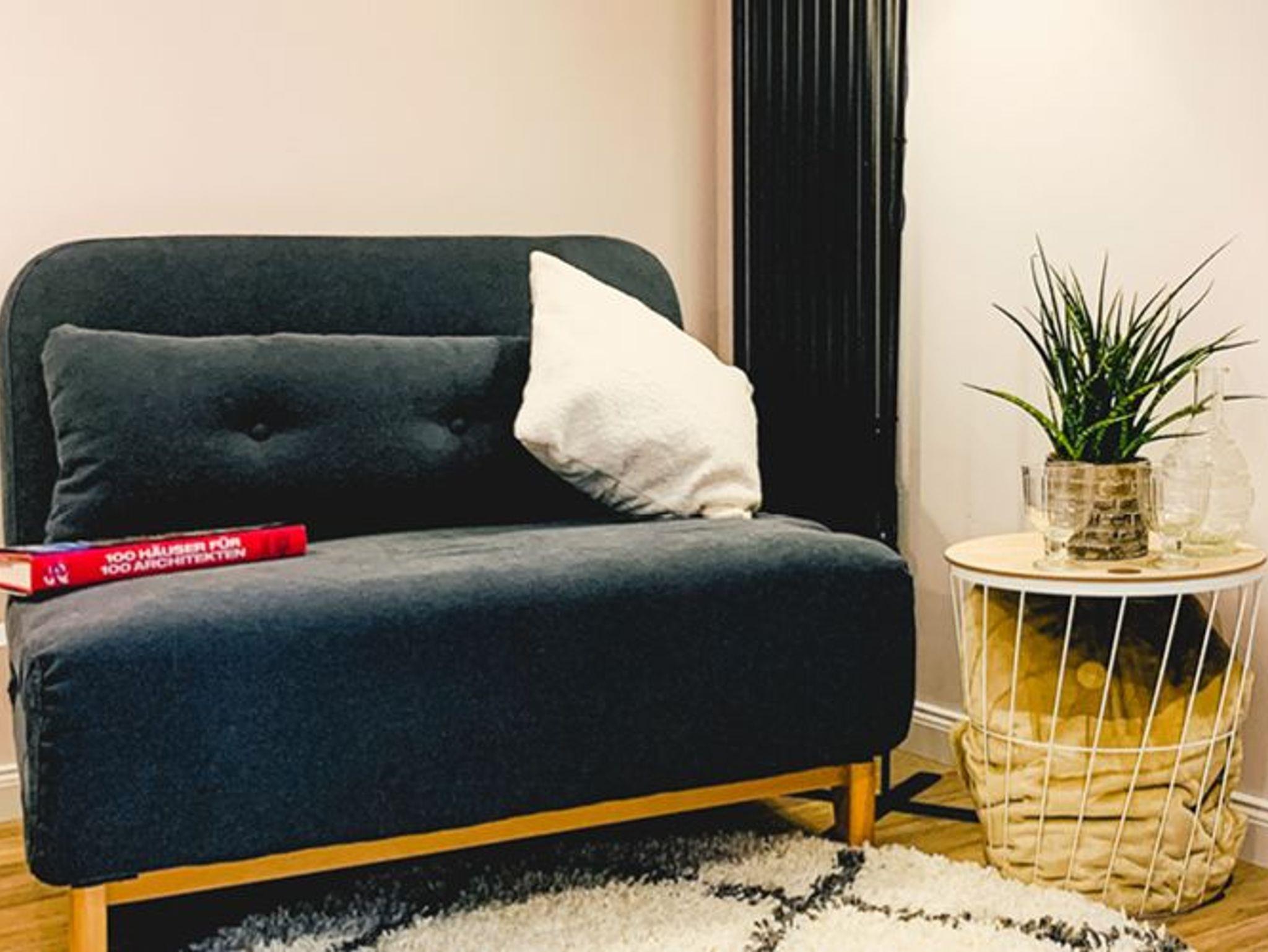Auf ca. 26 m² erwartet euch ein individuell eingerichtetes Apartment mit einem Schlafzimmer mit Boxspringbett in Queensize Größe (Größe: 160x200) und einem eigenen Ess- und Wohnbereich. Die Küchenzeile ist mit zwei Induktionskochfelder, einer Spüle und einem Kühlschrank ausgestattet. Die anschließende Theke bietet genügend Platz zum Essen. Der ausziehbare Lesesessel (Größe: 106x192 cm) kann als zusätzliches Bett genutzt werden. Das kleine Bad ist ausgestattet mit einer Dusche, flauschigen Handtüchern und einem Fön. Das Apartment verfügt über einen Smart-TV für Streaming und kostenfreies WLAN.