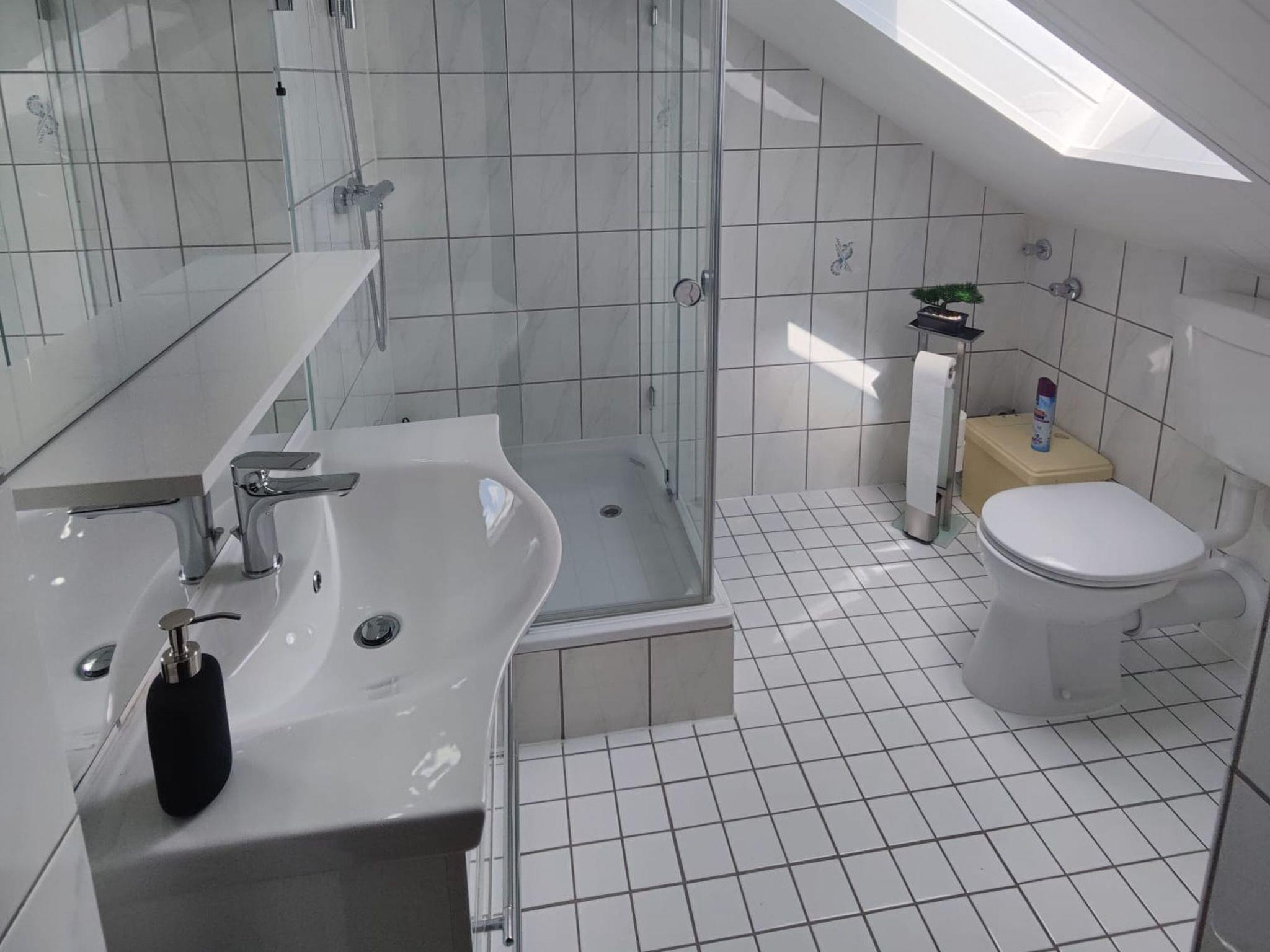 A staircase leads to the upper floor, where there are 2 bedrooms. Here you will also find the stylishly tiled bathroom with soothing bathtub and rain shower as well as a separate WC and dressing room.