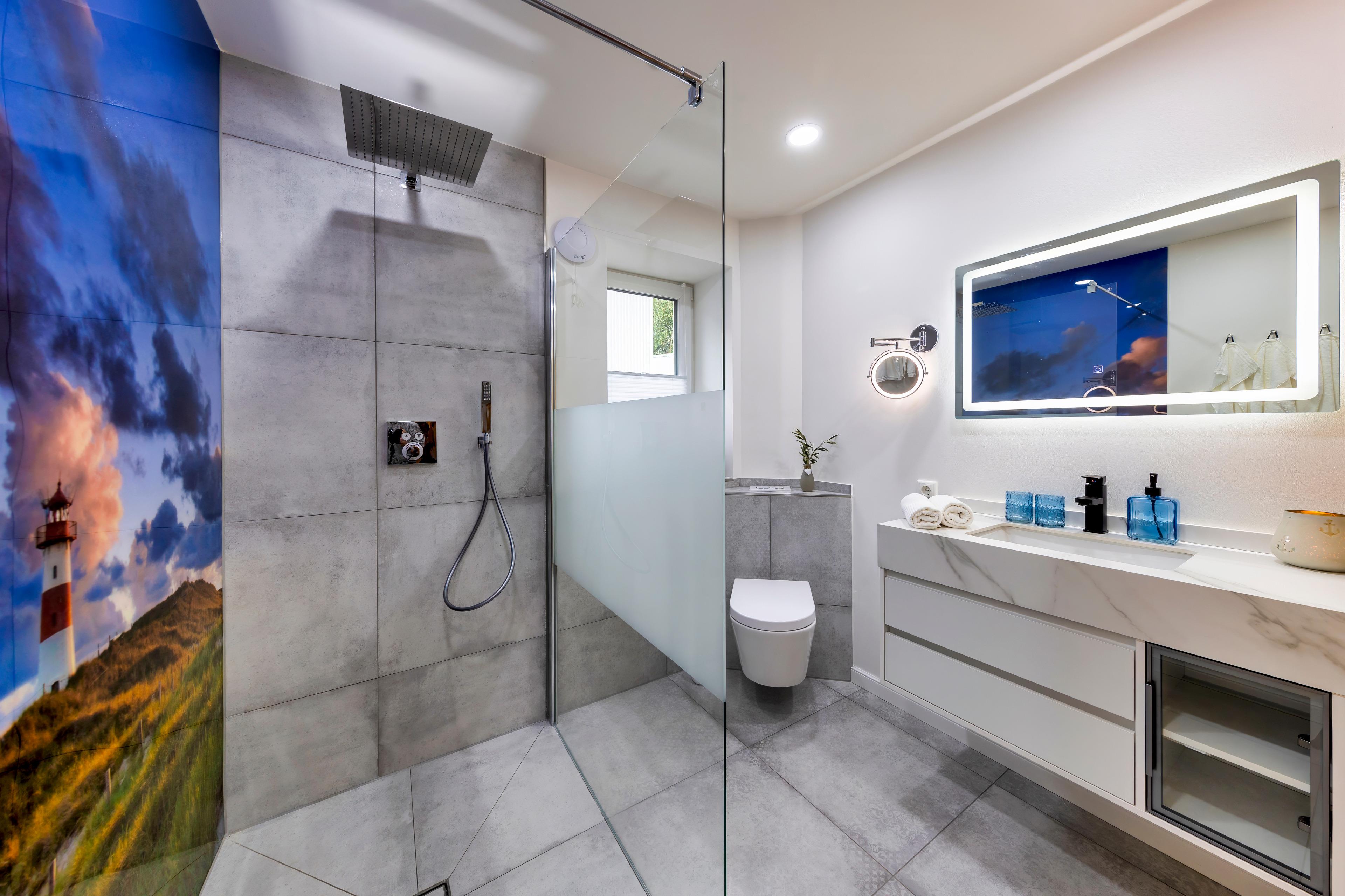 Eine Fußbodenheizung sorgt im ganzen Haus für wohlige Wärme und eine Klimaanlage rundet das ganze ab. In den stilvollen Bädern finden Sie bodengleiche Duschen und Infrarotkabinen, die nach einem erfrischenden Tag an der Nordsee zum Aufwärmen einladen. Genießen Sie ein Glas Wein bei Kerzenschein und entspannen Sie anschließend im bequemen Boxspringbett, vielleicht mit einem Film auf dem großen Flachbildfernseher.