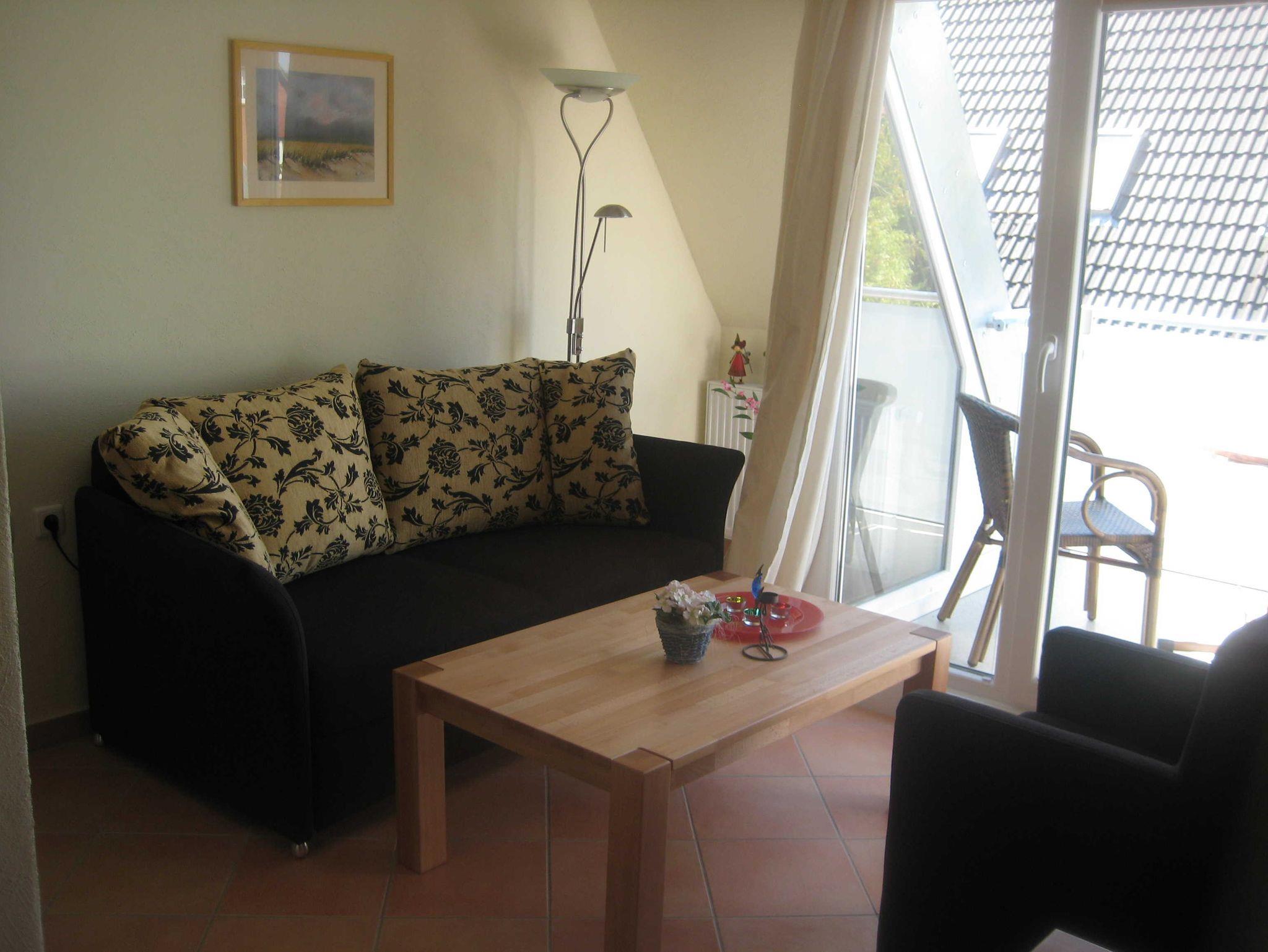 Die 48m² große Wohnung befindet sich im Obergeschoss des Hauses und bietet Platz für bis zu fünf Personen. Alle Räume sind durch einen Flur miteinander verbunden. Das innenliegende Badezimmer ist modern und hell eingerichtet.Es sind zwei separate Schlafzimmer vorhanden, wovon eines mit einem Doppelbett ausgestattet ist. Der Wohn- und Essbereich ist offen gestaltet. Die Küchenzeile ist modern und voll ausgestattet. Zur Wohnung gehört auch ein Balkon, der mit einer kleinen Sitzgruppe versehen ist. Ein zusätzliches Kinderbett kann auf Wunsch bereit gestellt werden.