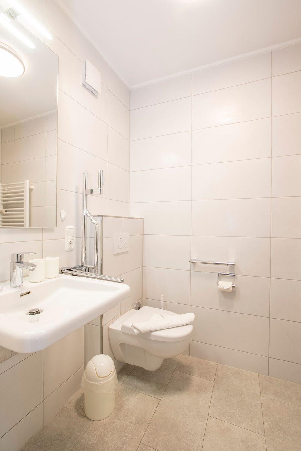 Das Bad einen bodengleichen Duschbereich sowie Waschtisch und WC.