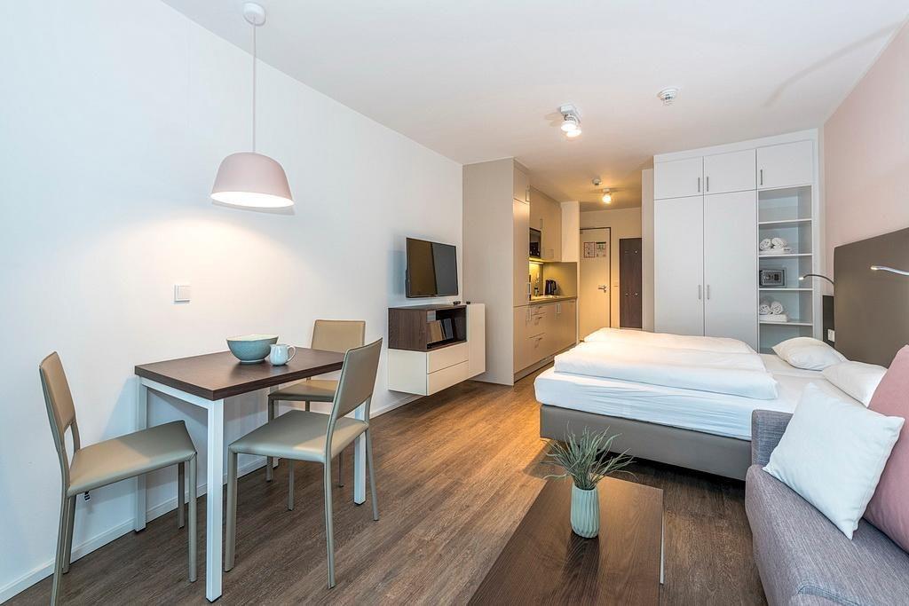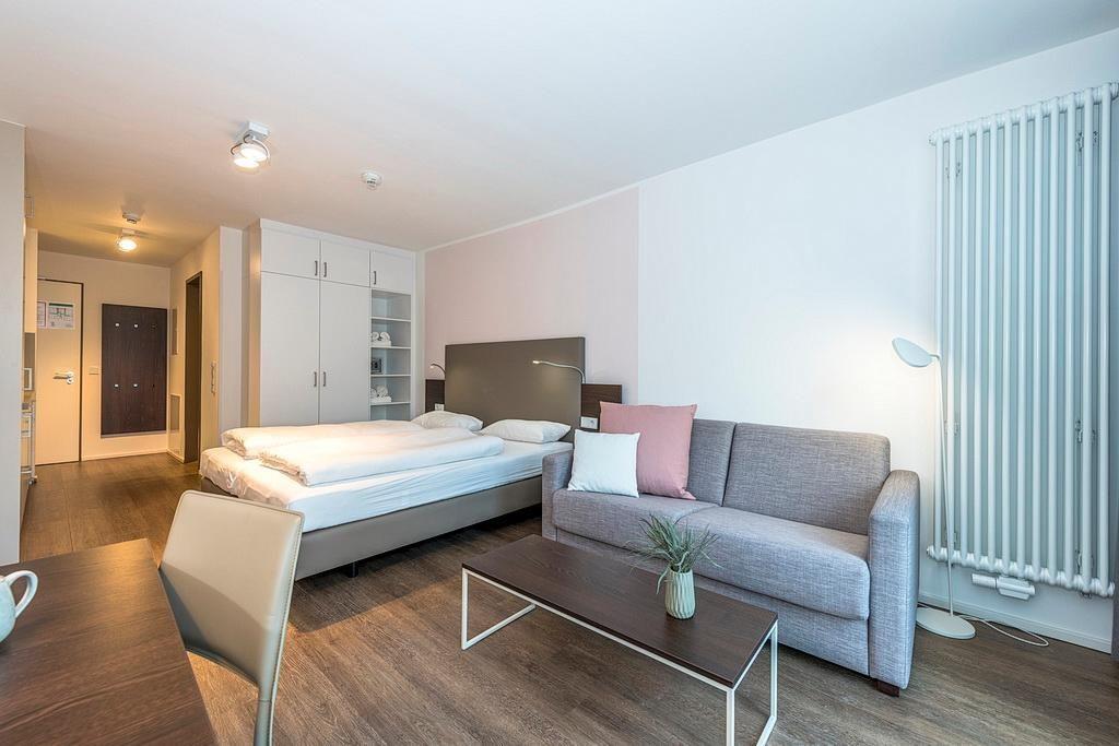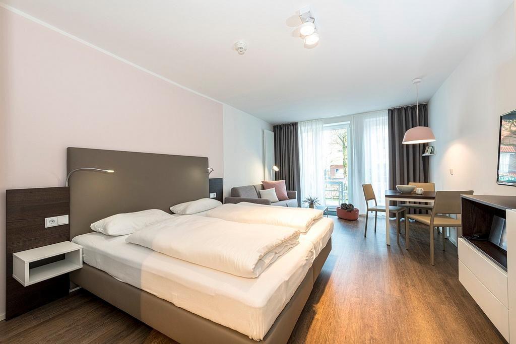 Das barrierearme Nichtraucher-Apartment verfügt über kostenfreies WLAN. Der Wohn- und Schlafraum bietet eine voll ausgestattete offene Küchenzeile mit Geschirrspüler, Gefrierfach, Kaffeemaschine, Toaster, Wasserkocher und Mikrowelle mit Grillfunktion sowie ein Doppelbett und eine Schlafcouch, einen großen Flatscreen-TV und Radio. Das Apartment verfügt über einen Esstisch und einen behaglichen Sitzbereich. Ein Kinderbett kann gegen Entgelt aufgestellt werden. Im stilvollen Badezimmer befinden sich eine große begehbare Dusche sowie ein Waschtisch mit Föhn und Kosmetikspiegel. Nach einem erholsamen Urlaubstag lässt es sich auf der mit Gartenmöbeln ausgestatteten Terrasse herrlich entspannen.